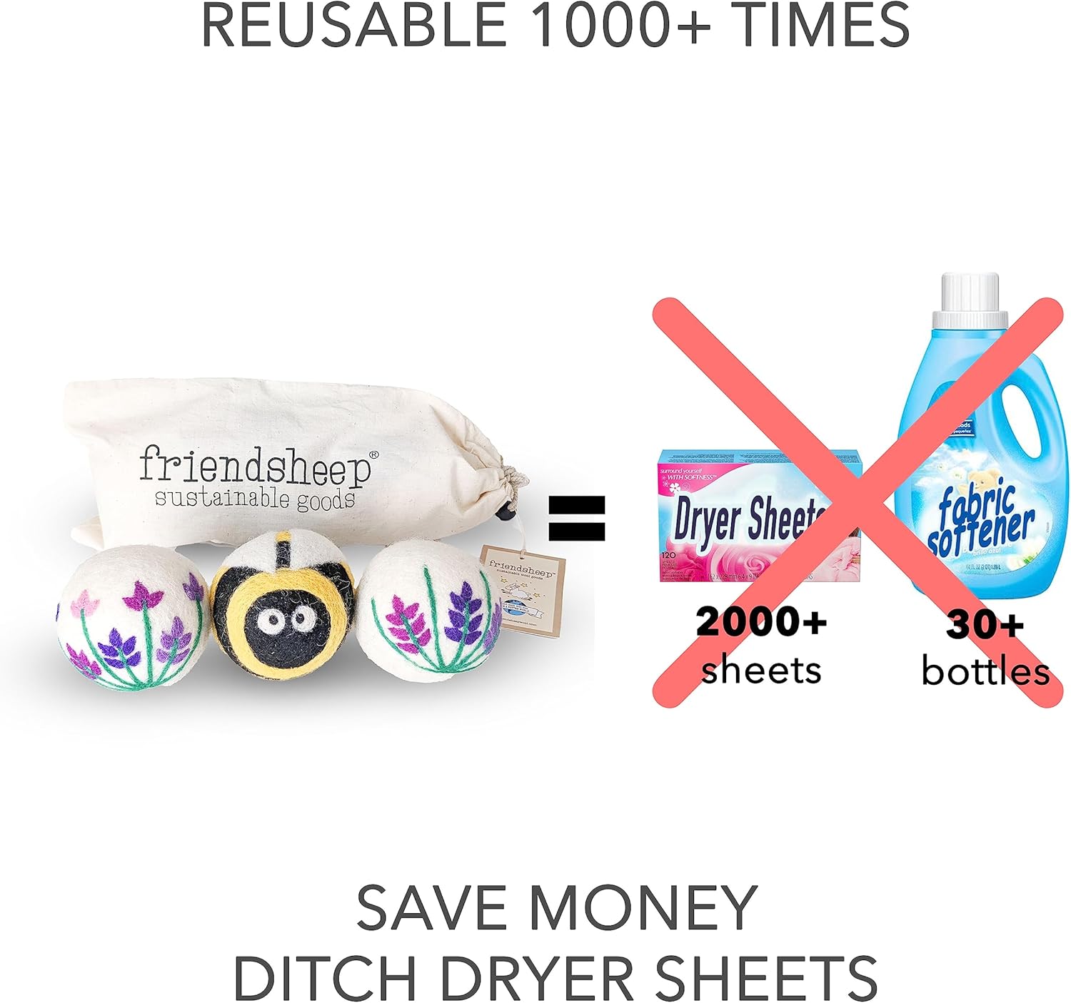 Friendsheep Wool Dryer Balls, Organic Reusable Fabric Softener Alternative for Laundry, Handmade, Fair Trade, Hypoallergenic, Eco-Friendly, Plastic-Free (3 Pack XL – Lavender Fields Bee Flower)