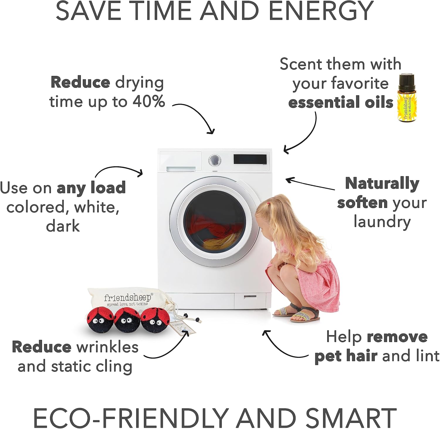 Friendsheep Wool Dryer Balls, Organic Reusable Fabric Softener Alternative for Laundry, Handmade, Fair Trade, Hypoallergenic, Eco-Friendly, Plastic-Free (3 Pack XL – Ladybug)