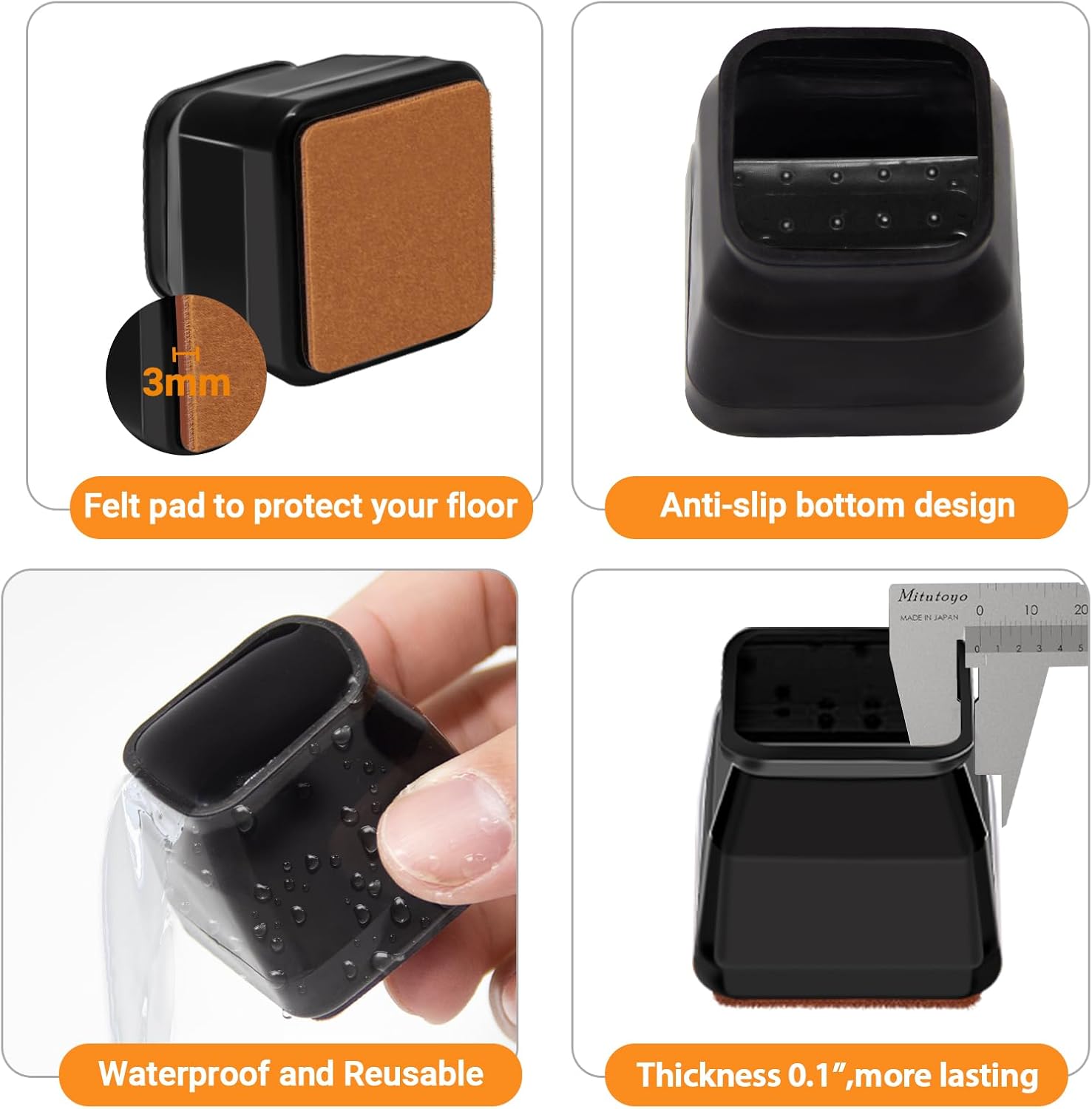 - ECO FRIENDLY AND LASTING: Our floor protectors for chairs made of eco-friendly silicone, nontoxic, safe for children & pets. Compared with the 1mm thick on the market, the inner wall of our upgraded furniture sliders for hardwood floors was thickened to 0.1"( 2mm ),the bottom was thickened to 1/5" (5mm), which greatly enhanced the abrasion resistance and elasticity.Our felt pads for furniture doesn't slips off, thick and won't tear. Effectively protect your hard surfaces and tile floors!
