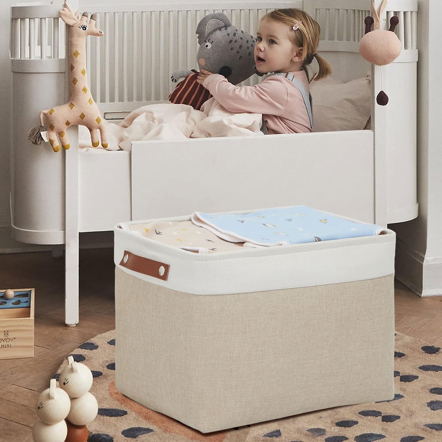 - 【EASY TO CARE】The fabric decorative storage box is sturdy and has no odor. Built to last these bins are reinforced with an O-ring on the top to give shape and structure so they are NOT machine washable. Lined with a thin linen fabric, the large storage bins are easy to clean, just wipe them with a damp sponge or cloth.