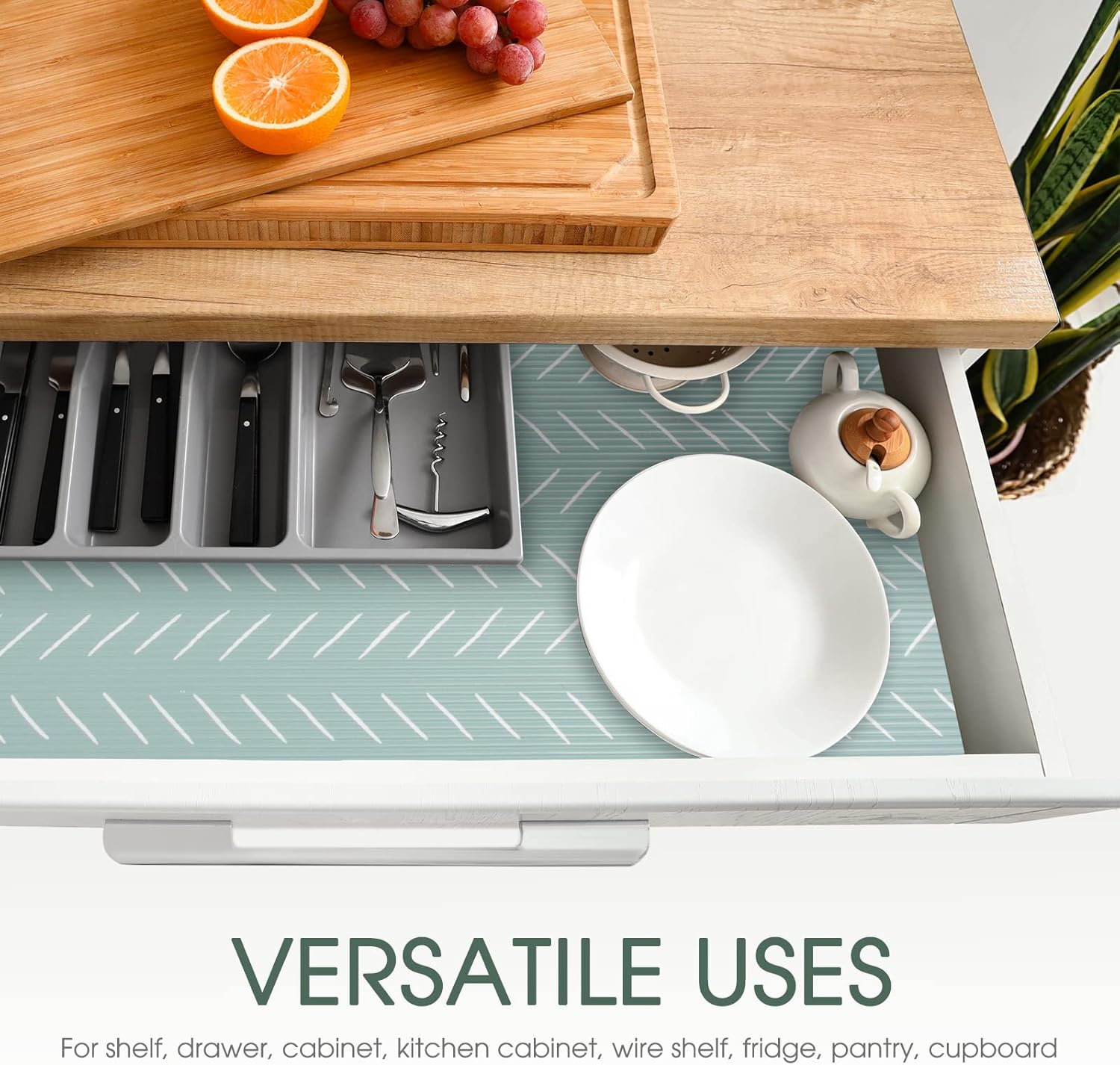 - Non Slip Shelf Liner for Storage Solution:Measured 12” x 20 FT, with a non-slip double-sided mat, the shelf liners help prevent spills in storage spaces by keeping your items locked in place and free from unwanted dirt and debris. The green herringbone design of this wire shelf liner is not only beautiful but also effective to secure your belongings on the wire shelf, glass shelves and so on