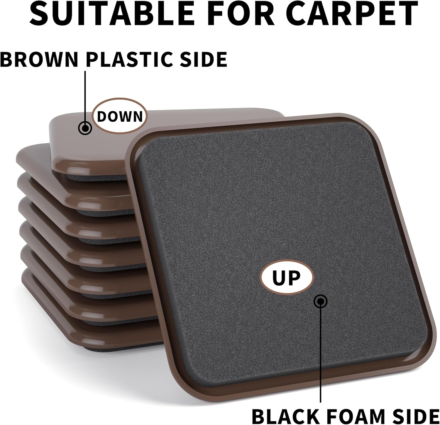 - FURNITURE MOVING PADS PROTECT ALL CARPET SURFACES - 20 pcs 3 1/2” brown square furniture sliders for carpet. Just put these rubber foam under the furniture feet to move it, no more scratches and noise here!