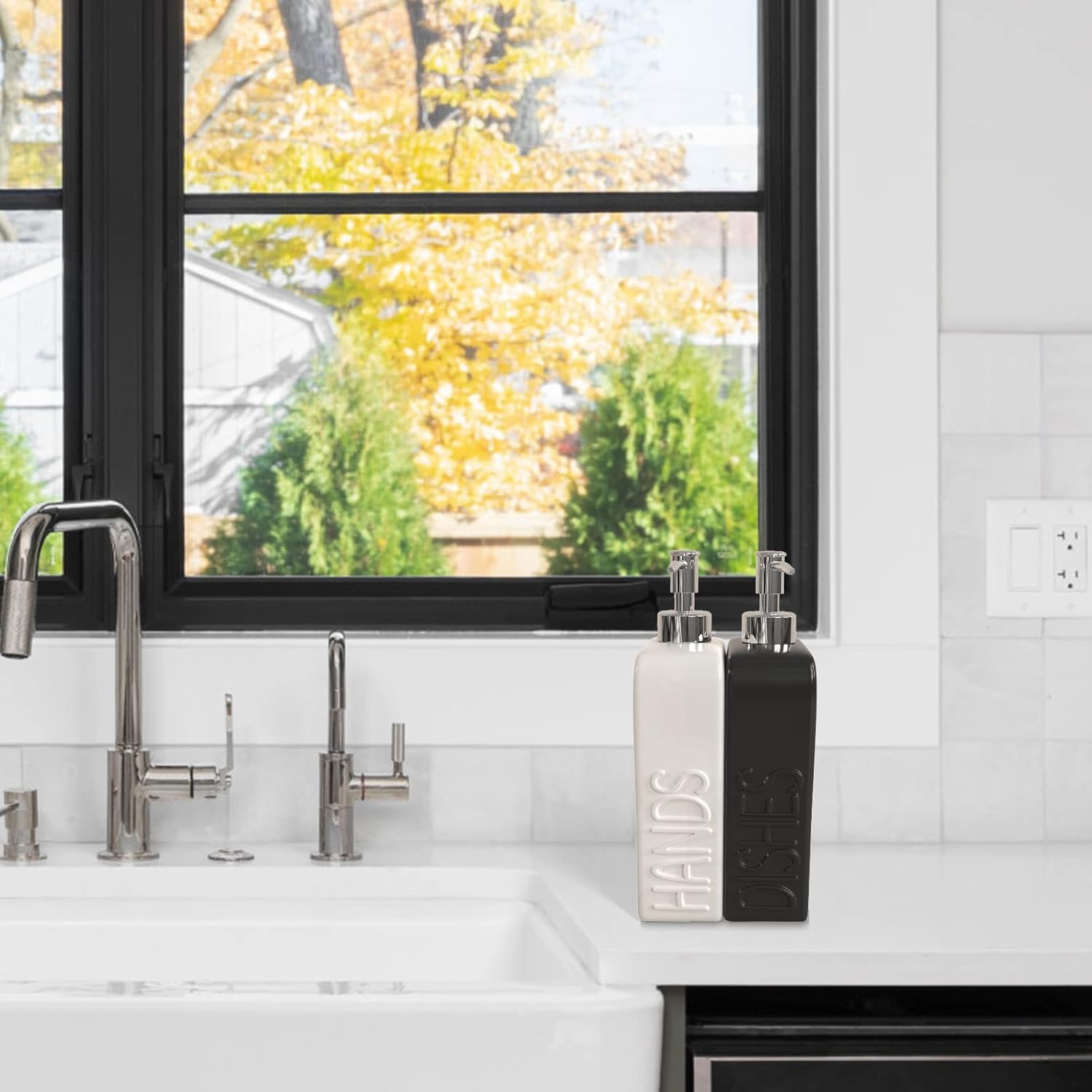Soap Dispenser Set with Funnel, Non-Slip Silicone Pads, 2 Pack Ceramic Refillable Dish Soap and Hand Soap Dispenser for Kitchen, Bathroom, Matte Black and White