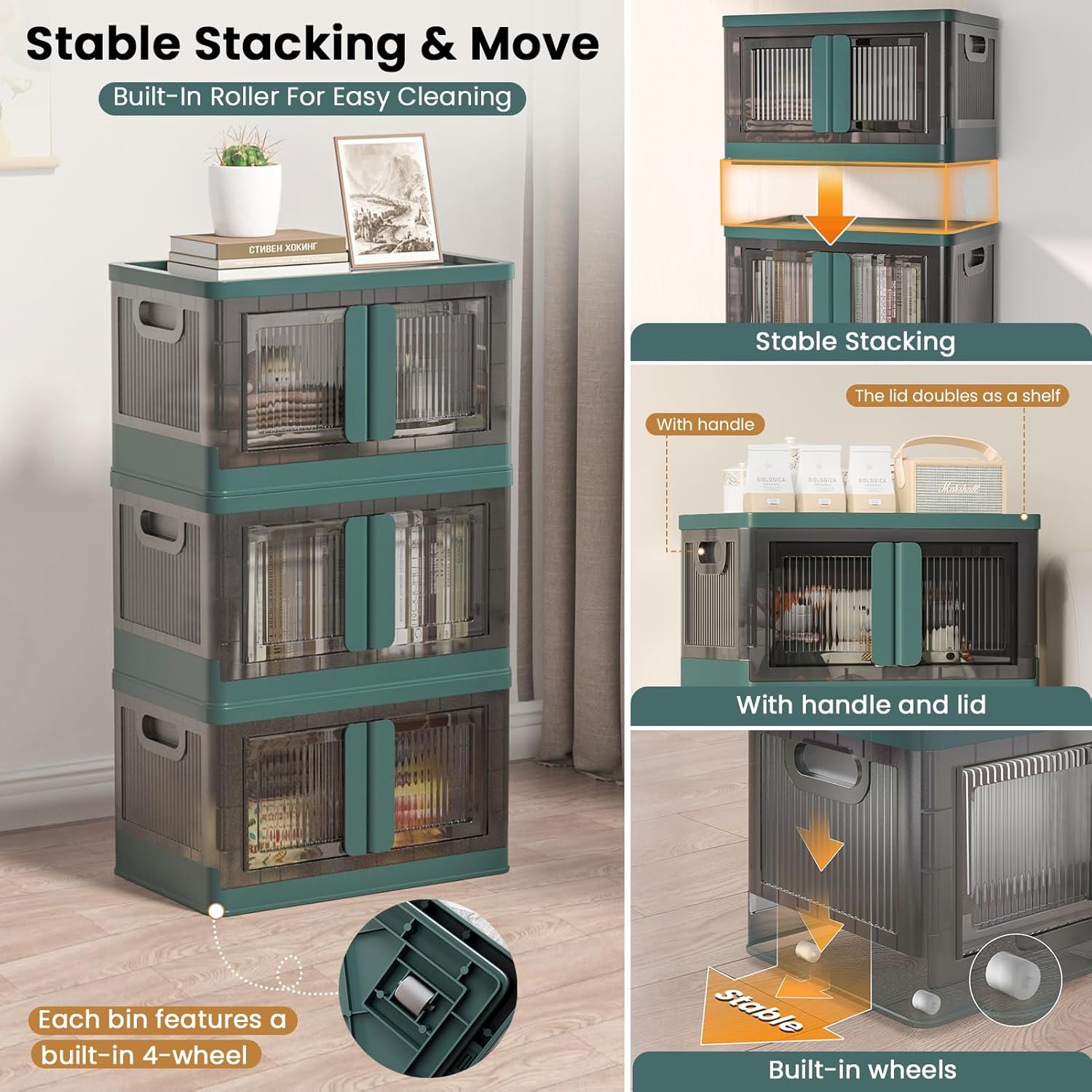 8.4Gal Collapsible Storage Bins with Lids & Wheels - 2 Pack Stackable with Doors, Heavy-Duty Plastic Containers for Home/Office, Green