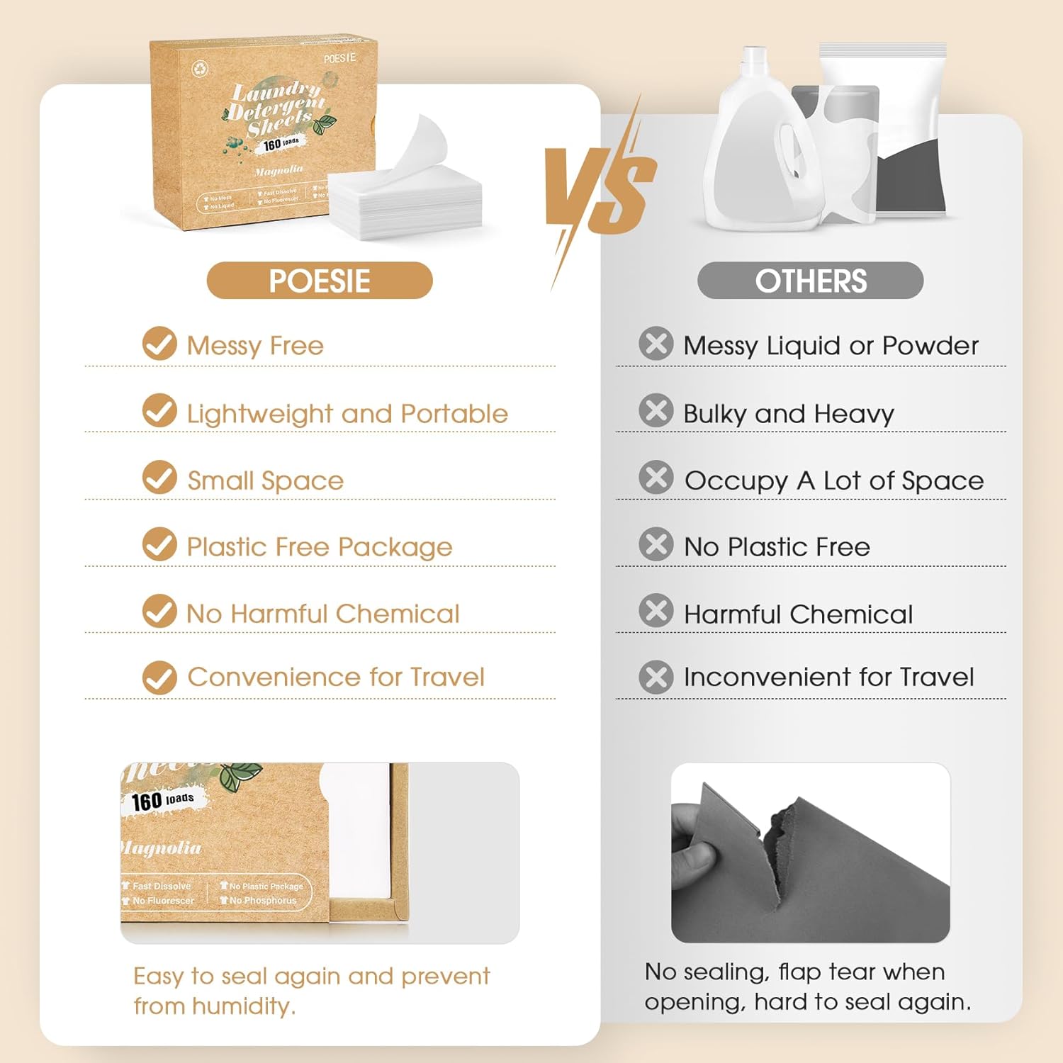 Poesie Laundry Detergent Sheets Magnolia Scent 3 Pack 480 Strips Liquid Less Effective Cleaning Zero Waste for All Washing Machine Traveling Dorm Life Save Space