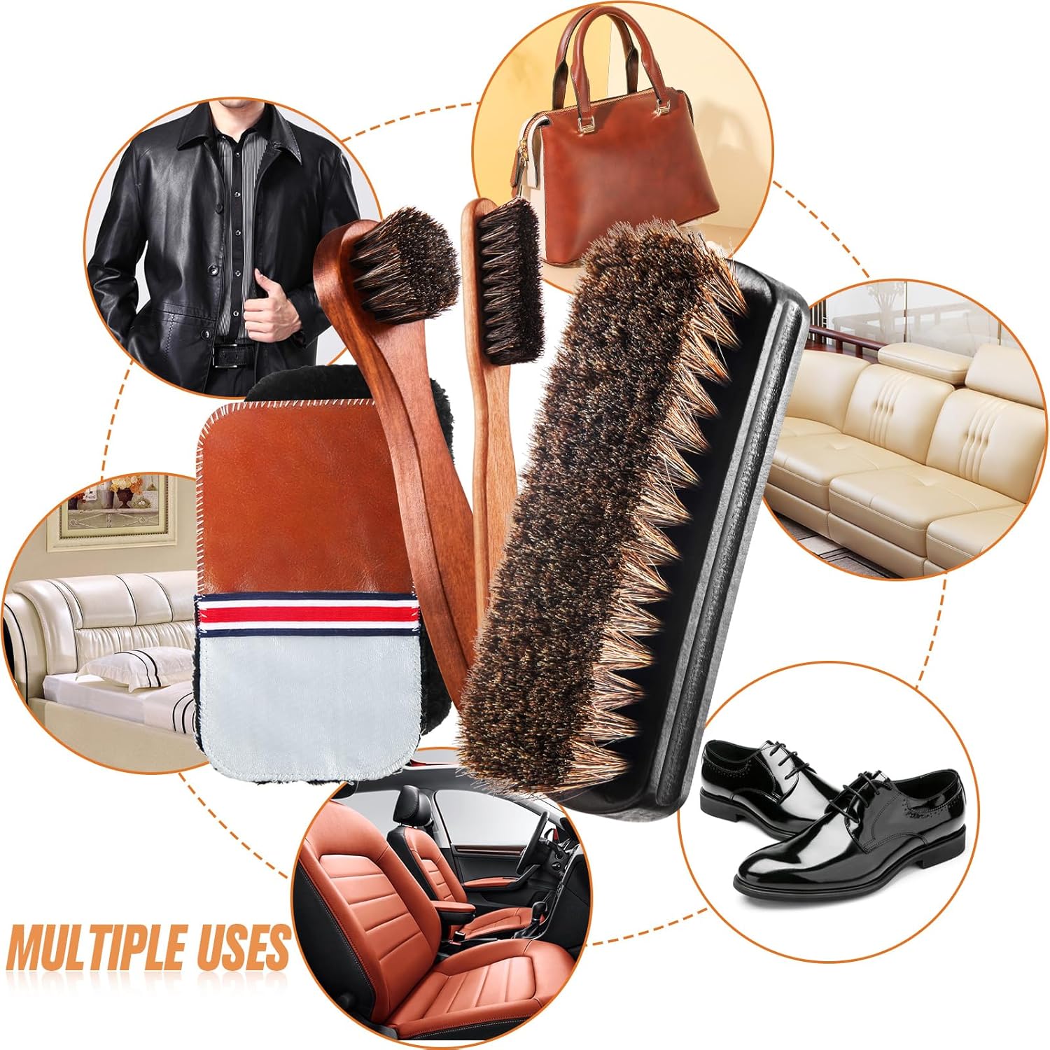 - Mufti-functional shoes brush set - This set contains 1 pieces shoes brushes, 1 piece long handle shoe cream brush, 1 piece horsehair detailing brush, 2 piece shoes shine gloves, suitable for shoes, handbags, luggage, boots, gloves, jacket, coat, car auto upholstery
