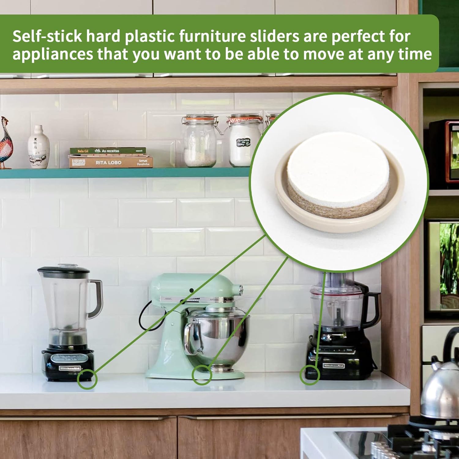 - 【Convenient Kitchen Appliance Slider】Stick the sliders around the bottom of the appliance firmly or attach on a wooden broad. It can not only increase the height so that the bottom of the machine does not touch water, but also allow the machine to be pushed, dragged and even rotated.
