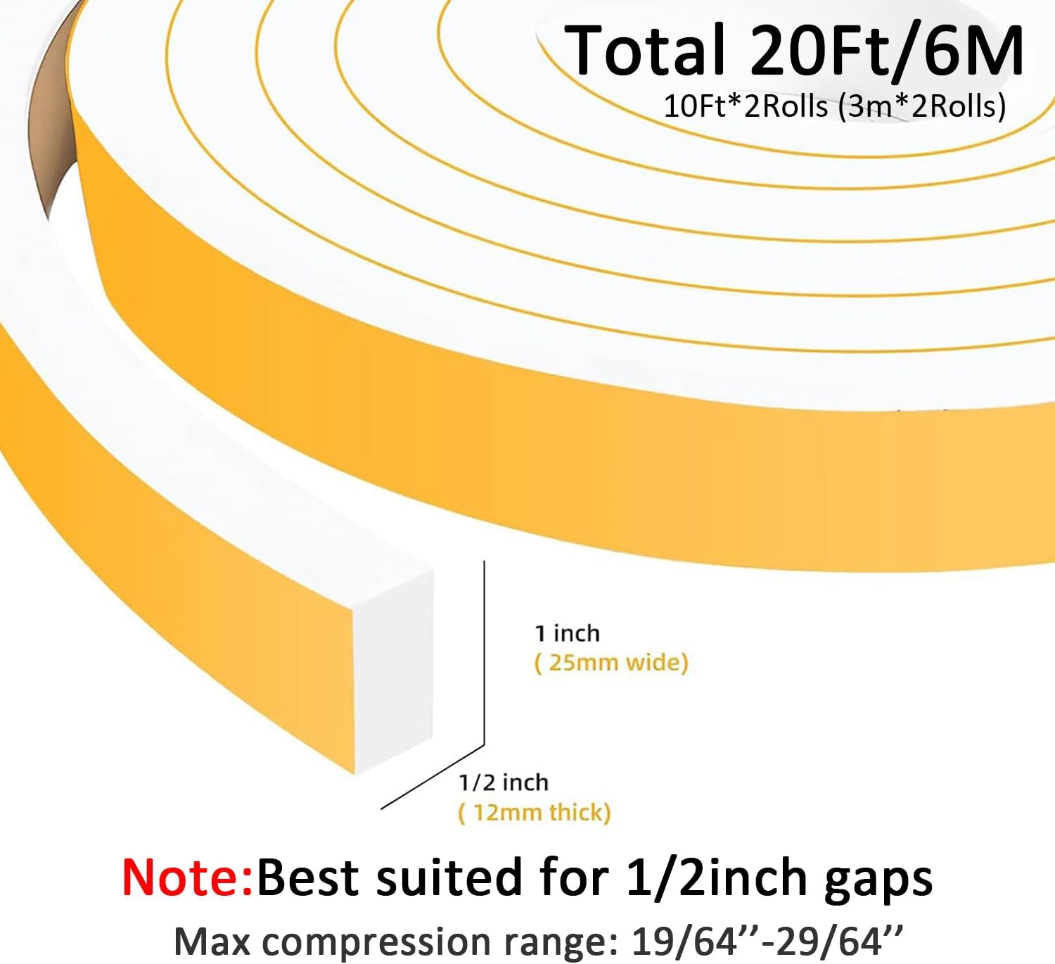 High Density Foam Weather Stripping Door Seal Strip Insulation Tape Roll for Insulating Door Frame, Window, Air Conditioner Self Adhesive Sealing Weatherstrip Dustproof (1 in x 1/2 in x 20 Ft)