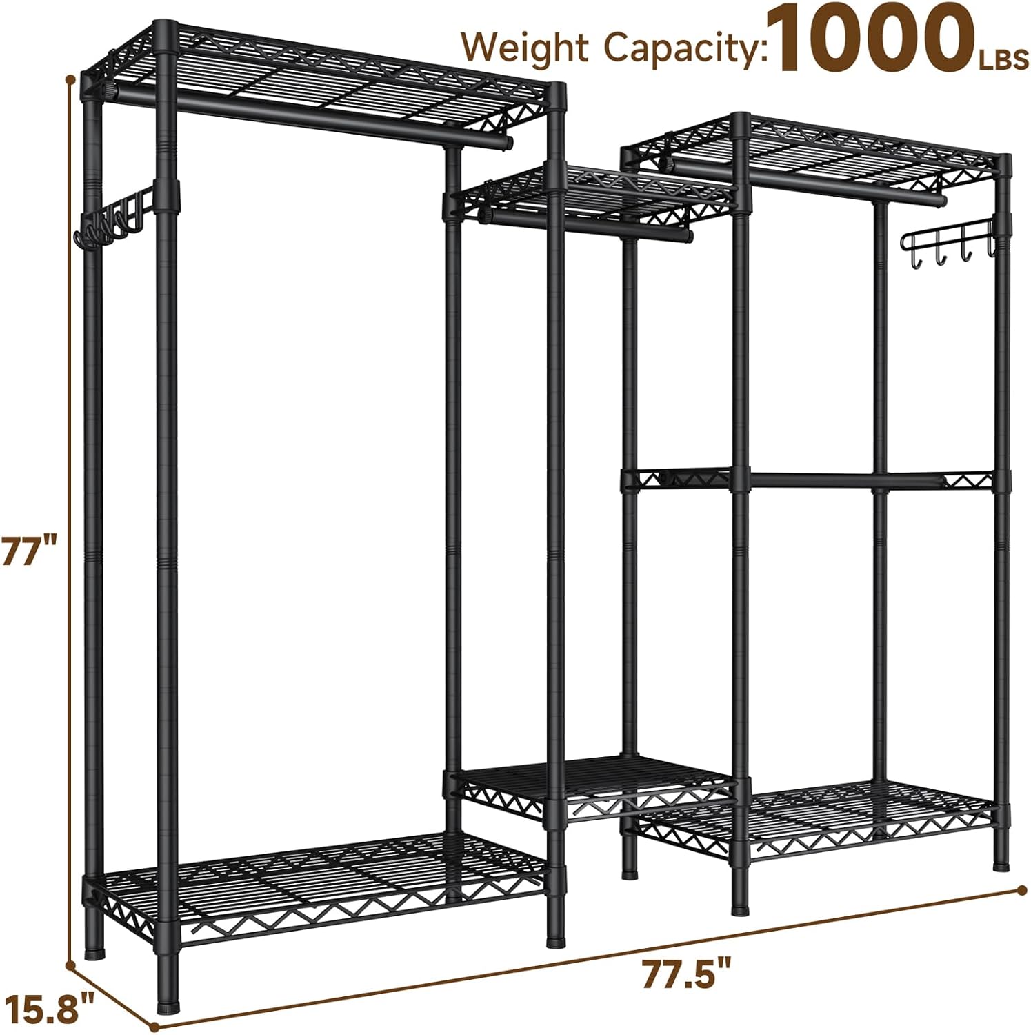 - Exceptional Strength and Capacity: Unleash the power of our Heavy Duty Garment Rack, meticulously engineered for superior strength. With dimensions measuring 15.75”DX77.5”WX76.37”H, this robust rack boasts an 1000lbs load capacity, featuring individual hanging rods supporting up to 80 lbs each.while each the side hook adds an extra 20 lbs of convenience.Enjoy the freedom to organize and store a substantial wardrobe without compromising on stability or durability