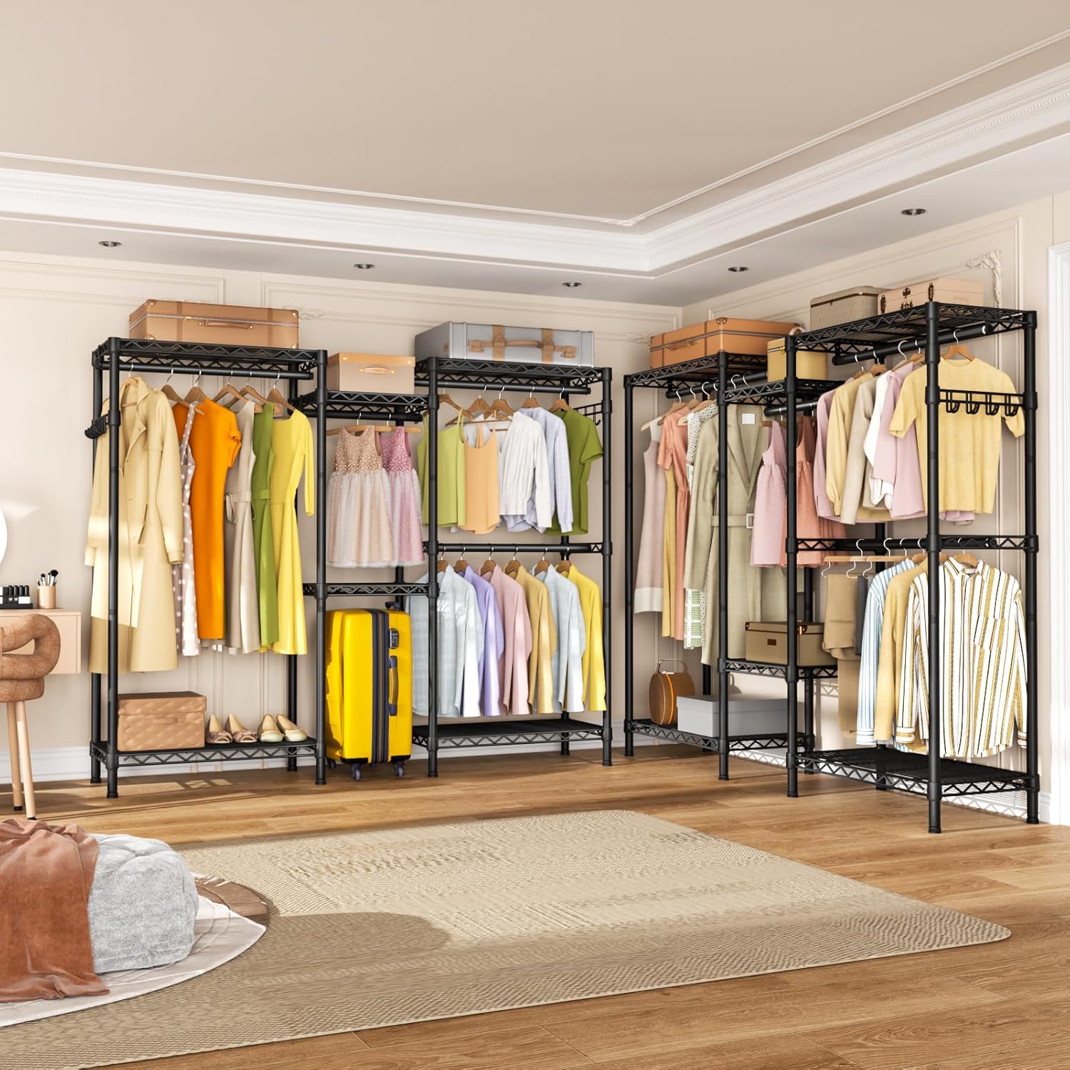 - Effortless Assembly & Dependable Design: Bid farewell to complex assembly processes. Our garment rack is designed for easy setup without the need for tools. The combination of user-friendly assembly and a large load capacity ensures a dependable storage solution that stands the test of time. Invest in a clothing storage system that effortlessly blends efficiency, durability, and style for an unparalleled storage experience
