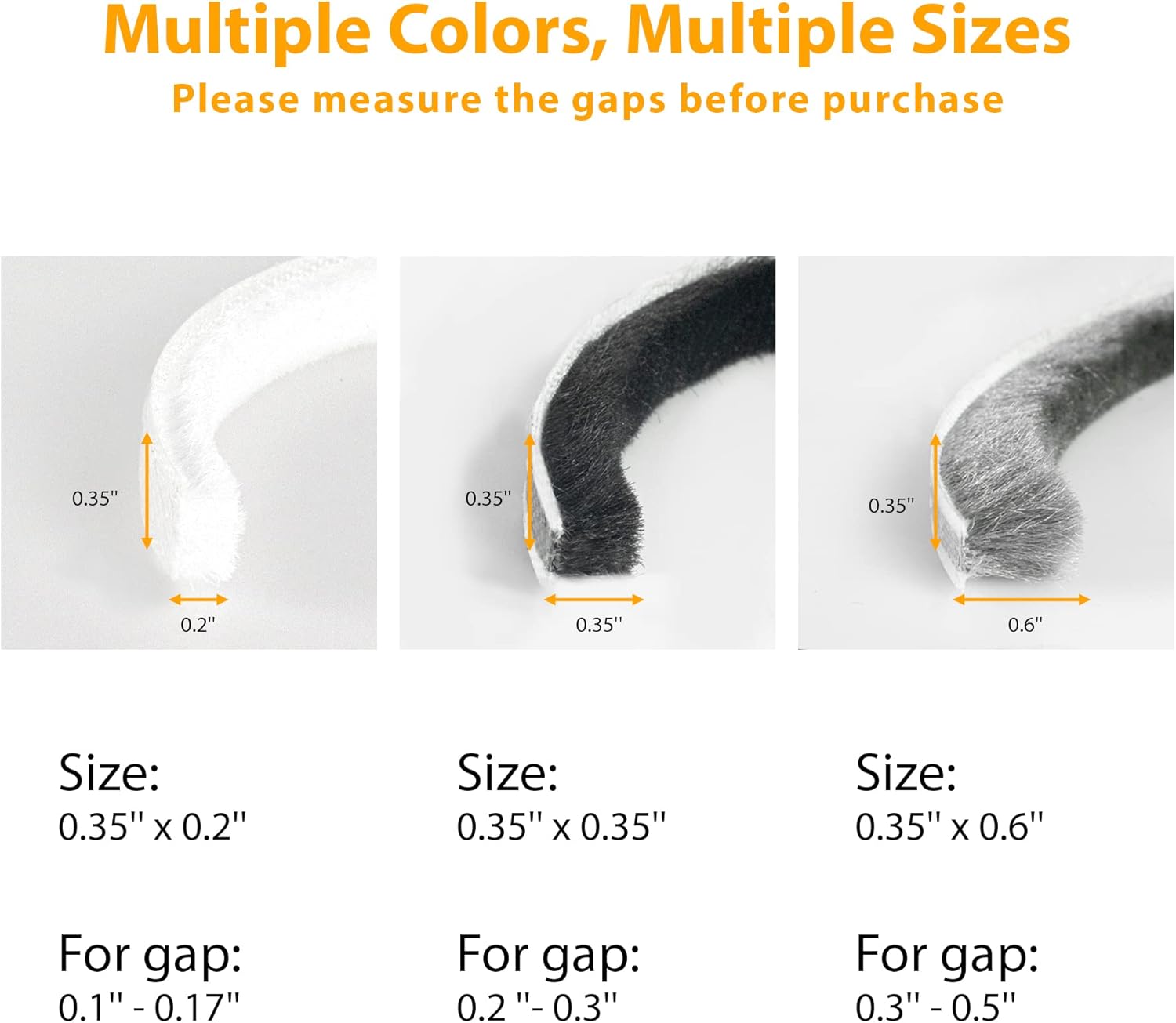 - 【Multiple Sizes Available】We offer brush sealing strip in 3 different brush lengths (0.2", 0.35" and 0.6"), 0.2" length brush for 0.1-0.17" gap, 0.35" length brush for 0.2-0.3" gap, 0.6" length brush for 0.3-0.5" gap. Note: Please measure the gap size of door or window, choose the correct size product