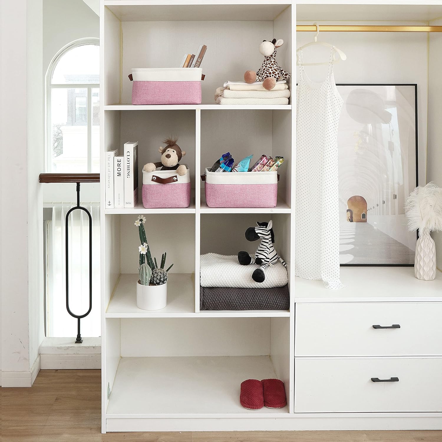OrganiHaus Small Fabric Storage Bins for Shelves 6 Pack, 12x8in Closet Storage Bins for Shelves, Cloth Baskets for Organizing, Linen Closet Organizers, Fabric Basket, Pink/White