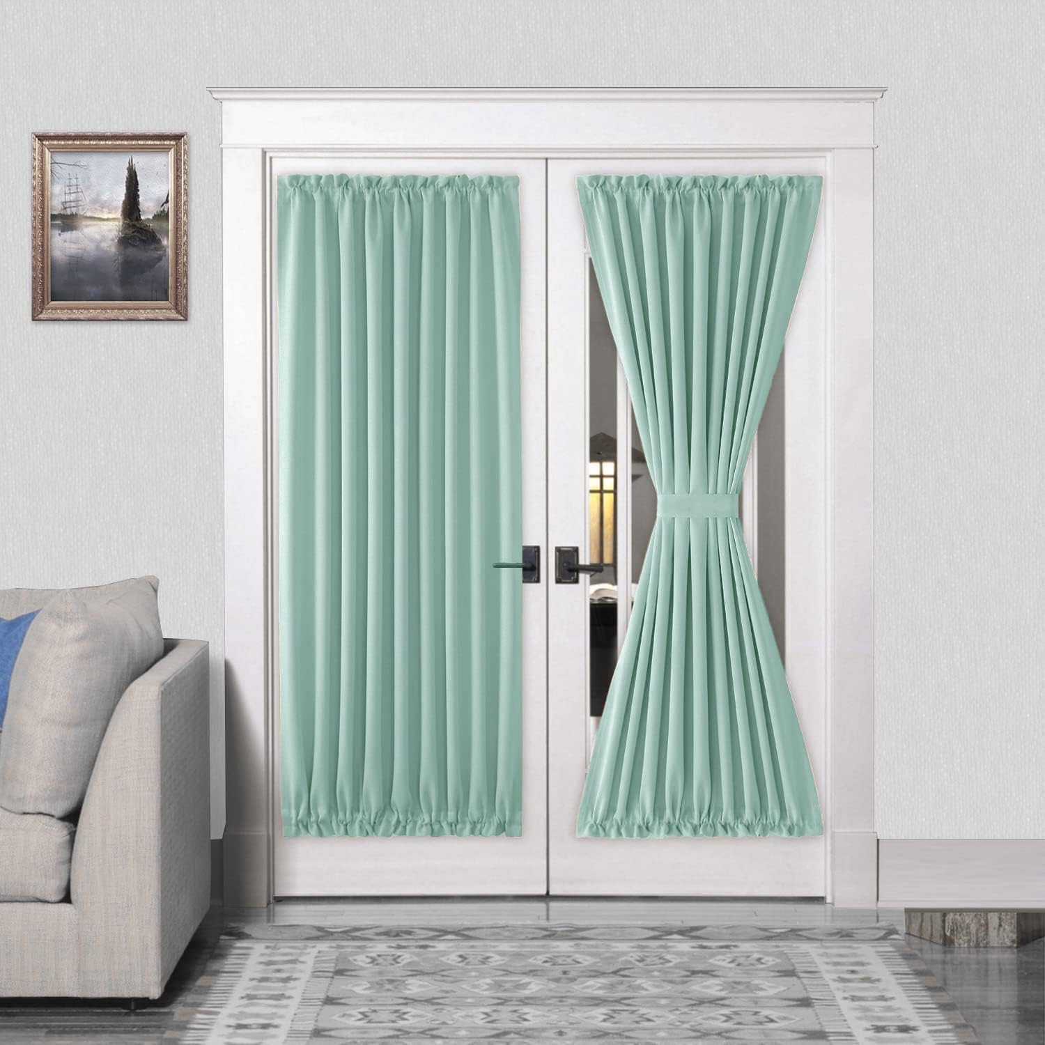 DWCN French Door Curtains – Rod Pocket Thermal Blackout Curtain for Doors with Glass Window, Kitchen and Patio Doors for Privacy, 54 X 72 Inches Long, 1 Curtain Panel with Tieback, Mint Green
