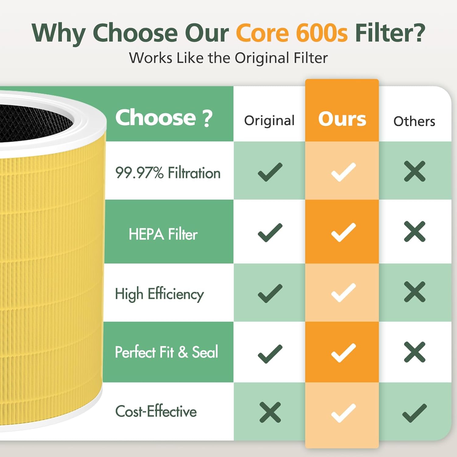 - 【UPGRADED TECHNOLOGY】- Our HEPA Core 600S Filter is safer than normal materials and can achieve a better purification effect than traditional. It can get rid of 99.97% of dust as small as 0.3 microns such as household dust, pet dander, and plant pollen.