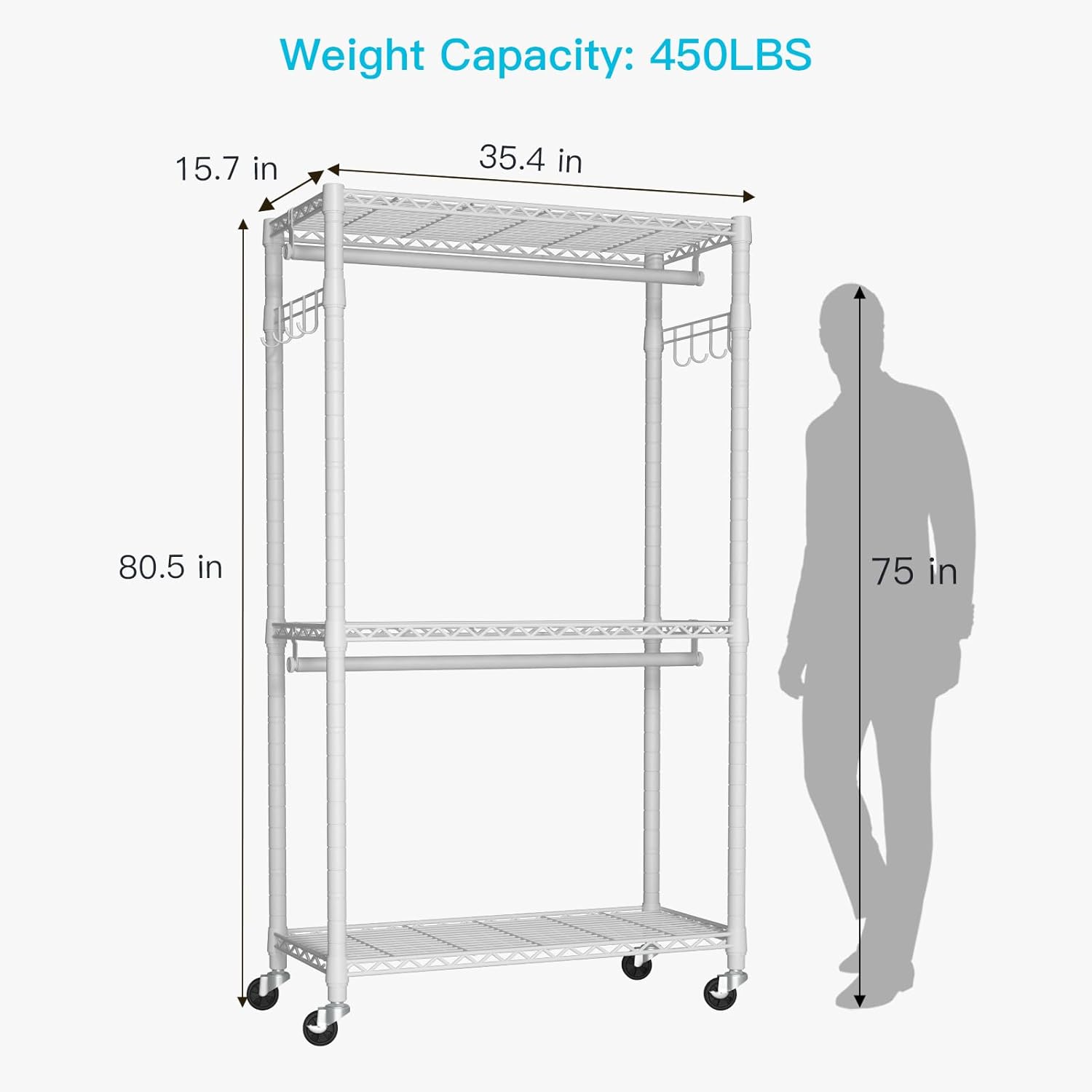FUTASSI P1 Heavy Duty Garment Rack, 3 Tiers Adjustable Rolling Metal Closet Organizer with Lockable Wheels, FreeStanding Wardrobe with Double Hanger Rods & 1 Pair Hooks, Max Load 450 LBS, White