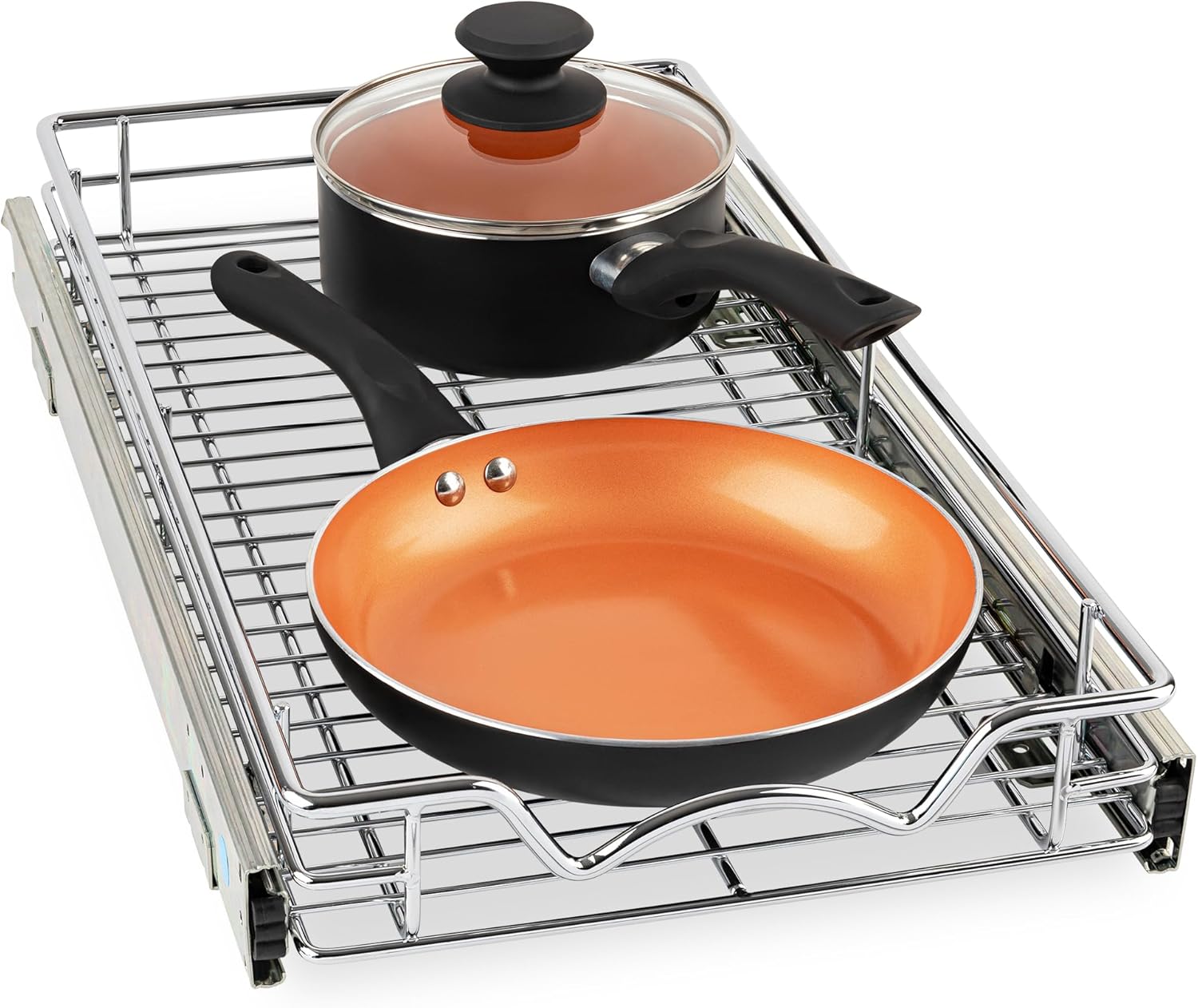 - HIGH QUALITY: Made of durable metal with chrome finish the pull out shelf for kitchen cabinet is simple and easy to install. Designed to fit any style of cabinetry and easy to clean.