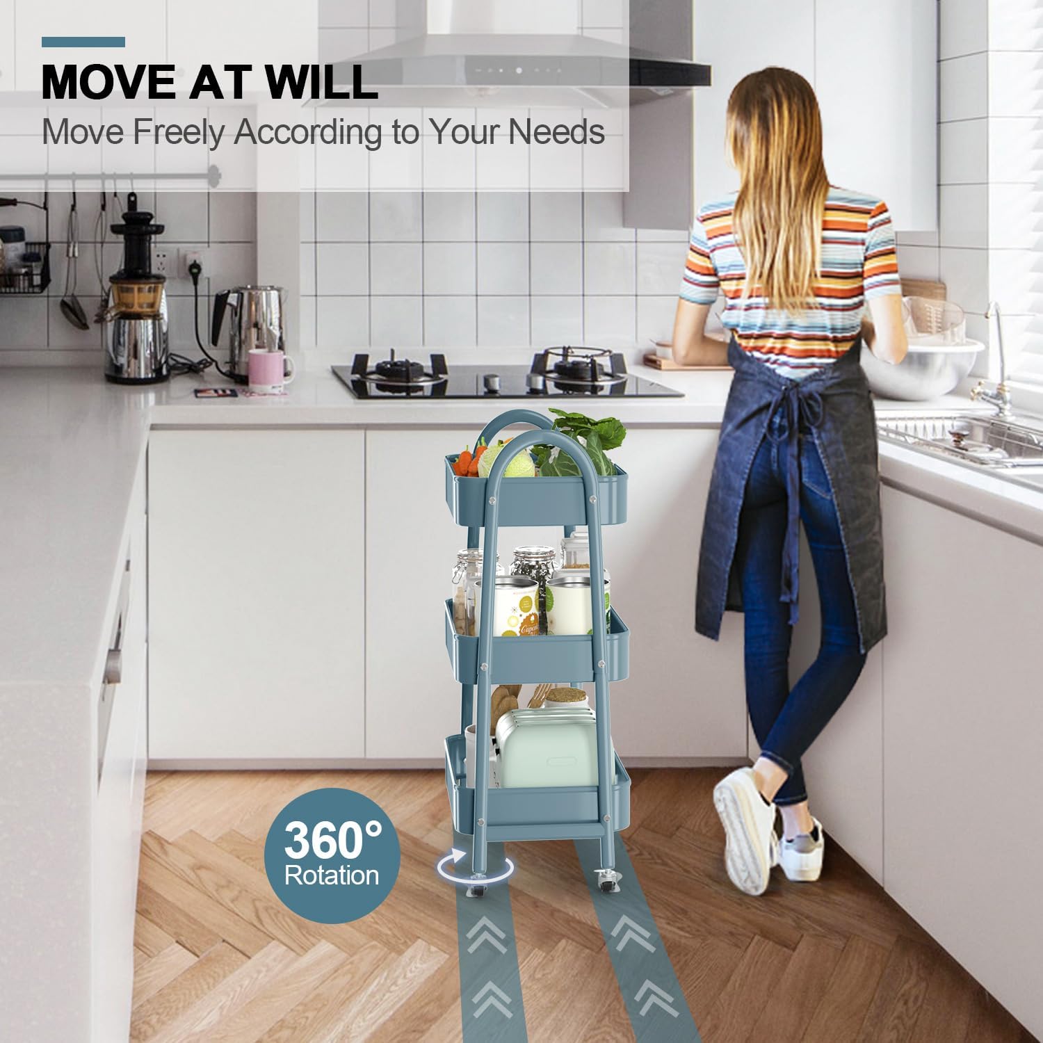 - Move or Lock At Your Will: Our rolling cart is equipped with 4 360° rotating wheels, easy to carry around and change place at will, two of wheels are lockable, provide stability. The modern curved handles design makes it more convenient to push and pull around as needed.