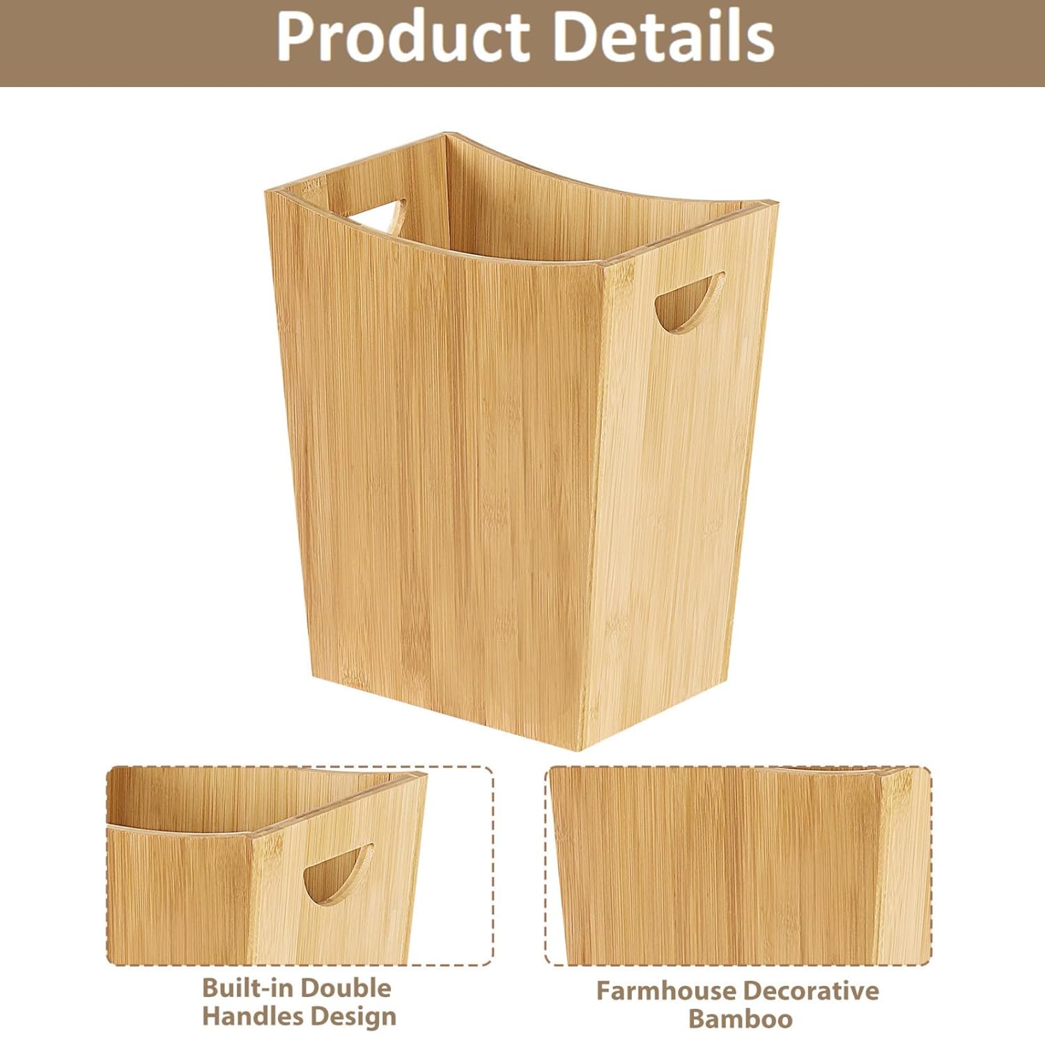 - NATURAL WOOD CONSTRUCTION: The farmhouse trash can is made from high-quality Wood that withstands long-term use. Durable and sturdy, healthy and eco-friendly, features with farmhouse bamboo texture, The rustic country design will complement your home decor and also can be recycled. The color may vary due to it being handy and made of natural Wood!