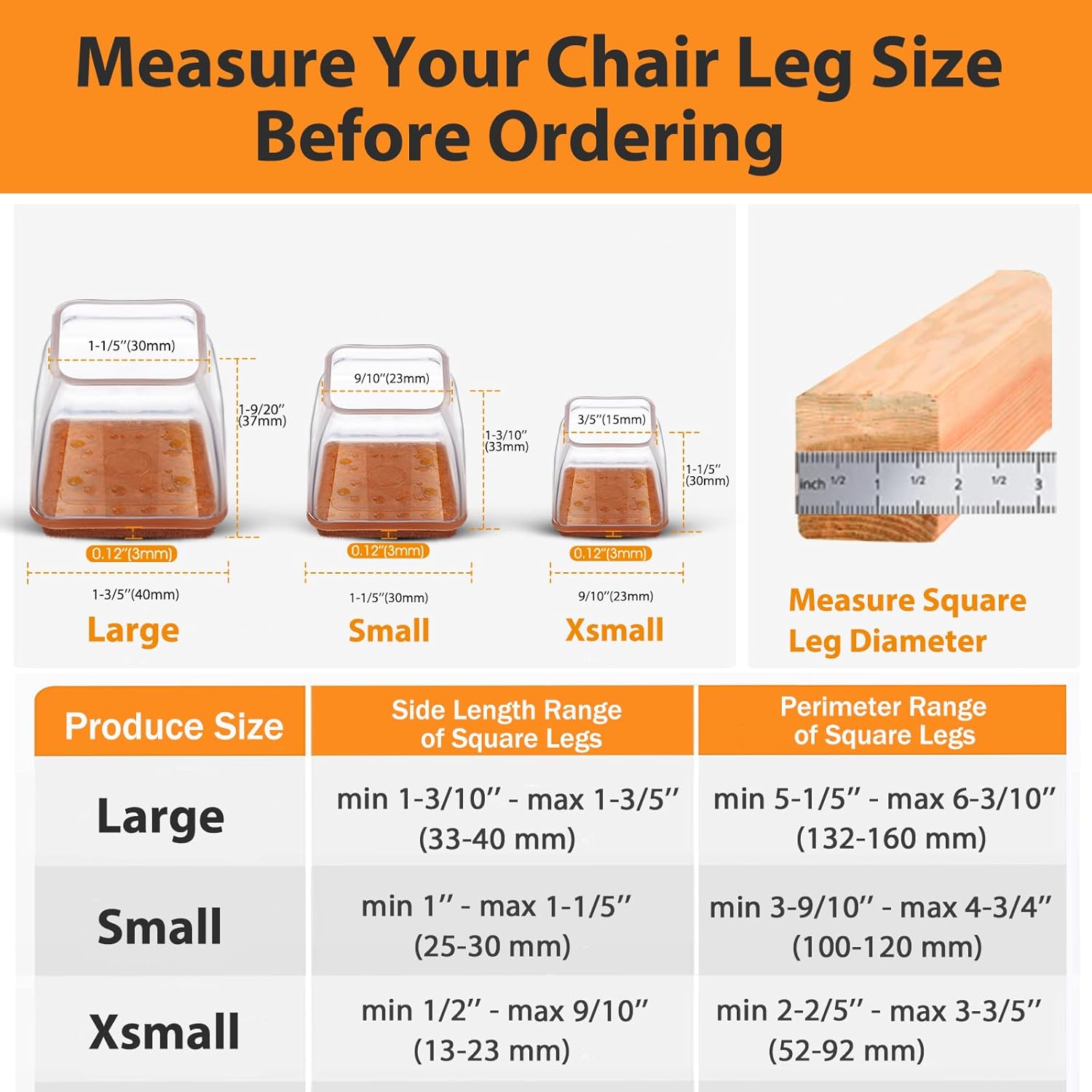 - APPLICABLE SHAPES AND SIZES: Our chair leg floor protectors only fit wooden square chair legs. Compared with the round chair leg caps, the square chair leg floor protector fits the square chair leg better. We have tow sizes chair leg protectors for hardwood floors.Please measure the size of your furniture feet before buying.The S size chair leg floor protectors square is suitable for square leg with side length 1" to 1-1/5"(25-30mm), irregular leg with perimeter 3-9/10" to 4-3/4"(100-120mm).