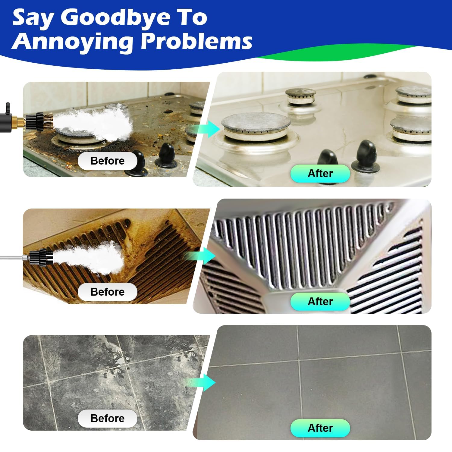 - Practical Accessories - This steam cleaner for home has several practical accessories: brass brush, nozzle, extension hose, nylon brush and heat-resistant gloves, it allows us to deal with corners, crevices and other small spaces with ease. The steam cleaning machine saves you time and energy, it makes cleaning a breeze.