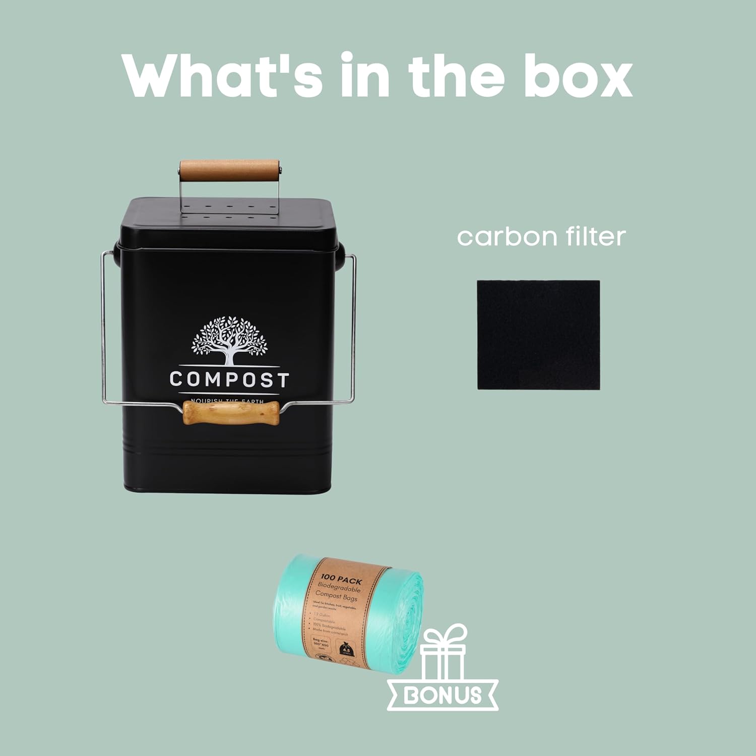 - The countertop compost bucket with lid comes with carbon filters to prevent odor leaking: The charcoal filter blocks odor naturally and effectively, leaving your kitchen smelling fresh. Put the lid on, and it becomes the perfect farmhouse kitchen decor without any unpleasant smells. Tips: The period of use of the carbon filter is about 4 months to 6 months. Please remember to replace it in time.