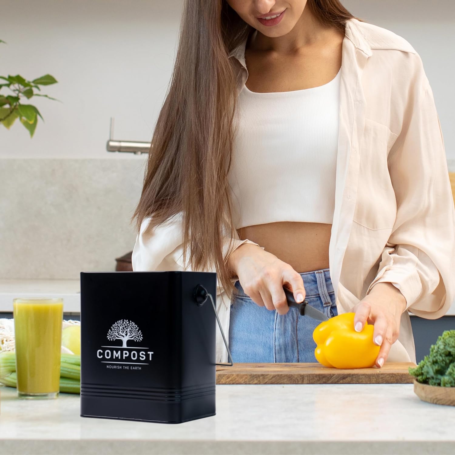 - Our kitchen compost bin considers aesthetics and practicality, and this trash can is a high-quality product that will accompany you in your actions of everyday life. This would also make a wonderful conscious gift. Easily clean with soapy water & soft cloth after use.