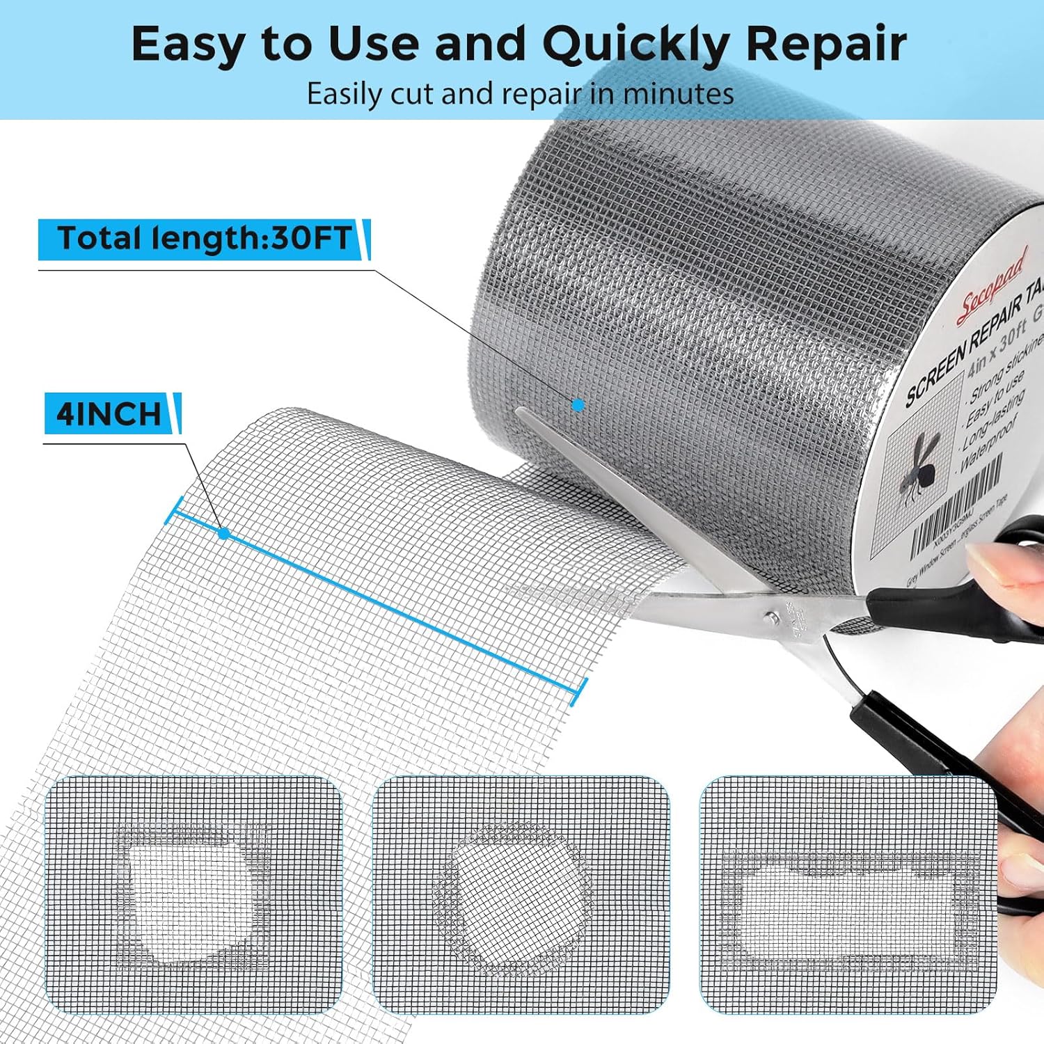 - Clippable and Save money: The size of the screen repair tape is 4 IN X 30 FT, you can cut a suitable size and shape or use more of them to repair a larger hole. No need to spend a lot to replace the entire screen mesh then