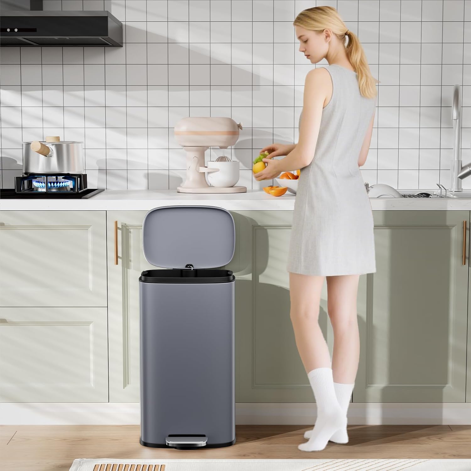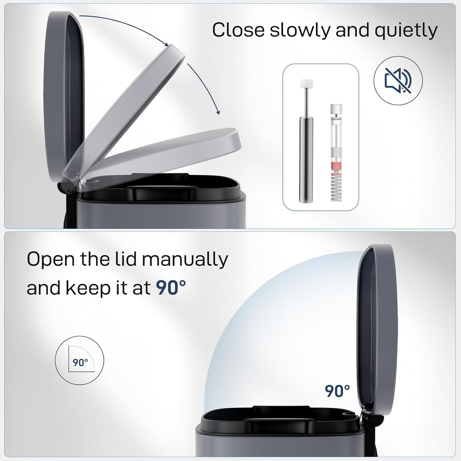 - 【WON'T DISTURB YOU】Using ABS hydraulic deceleration technology, the trash can lid can be slowly and gently closed when the pedal is released, without making a lot of noise, and it will not disturb your family when disposing of garbage.