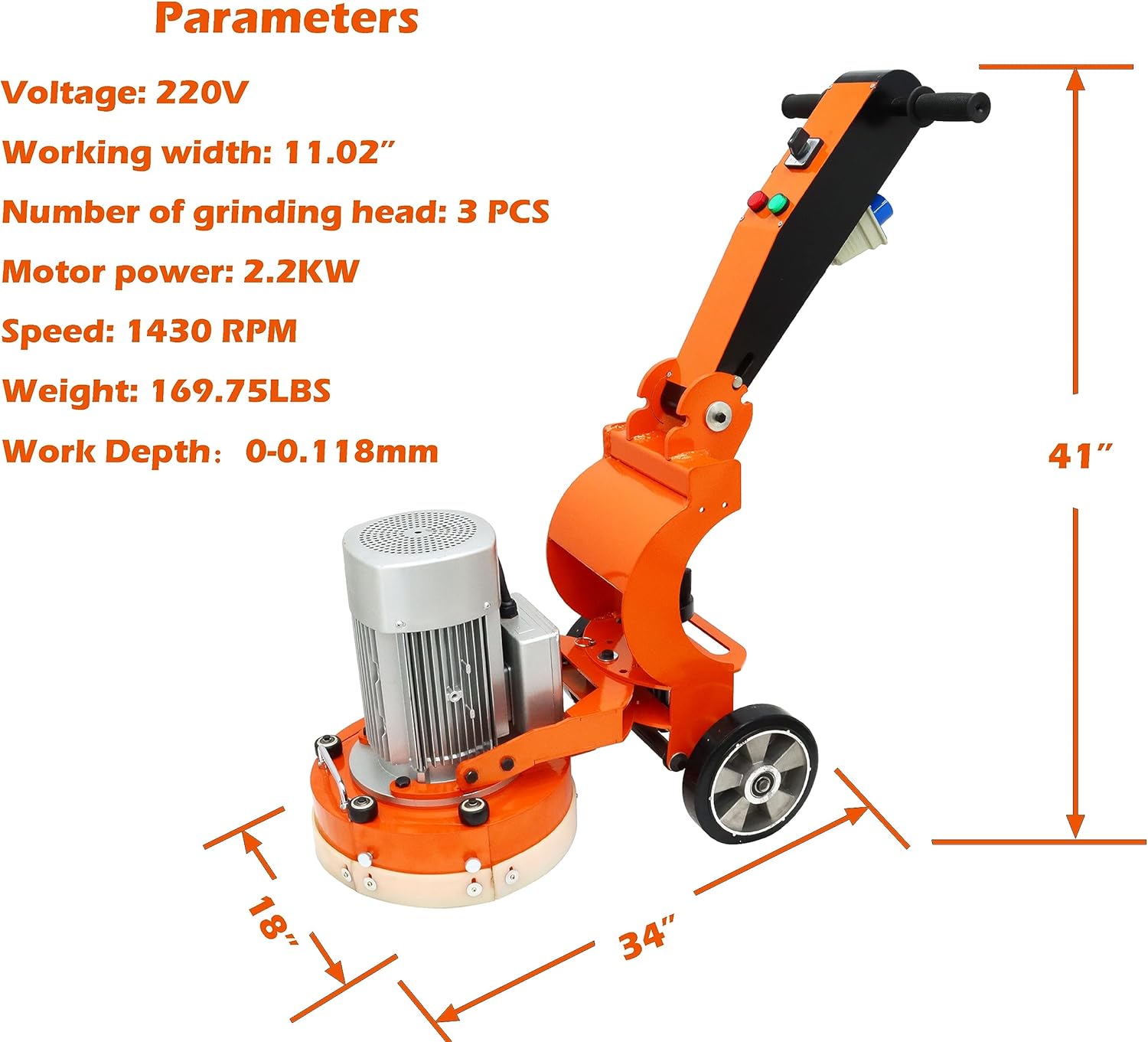 - With Powerful Motor:The 220V 2.2KW pure copper motor with rotating speed of 280rpm, which is efficient and durable. Note: when using, first lift the machine head off the ground,and then turn on the switch. After the grinding chassis rotates, gently place it on the ground.