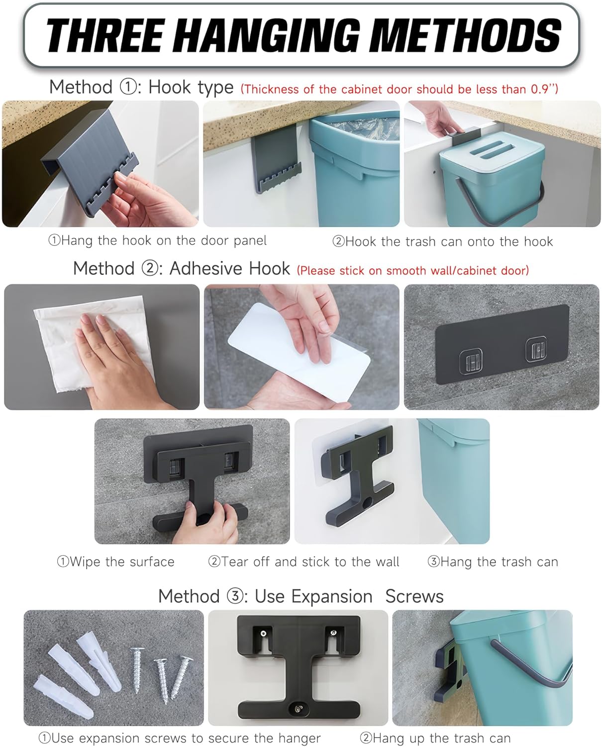 - [Under Sink / Wall Mount Trash Can] Hanging trash is an excellent choice for your daily activities. You can use it while you cook and then store it under the sink. Fit for most cabinet doors, pantry doors, cupboards, under sinks, walls, and countertops.