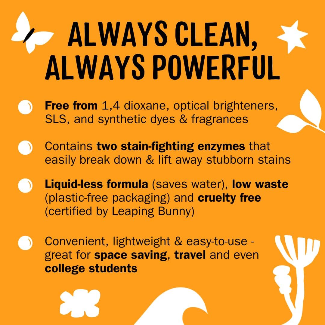 - Liquid-less formula (saves water), low waste (plastic-free packaging) and cruelty free (certified by Leaping Bunny)