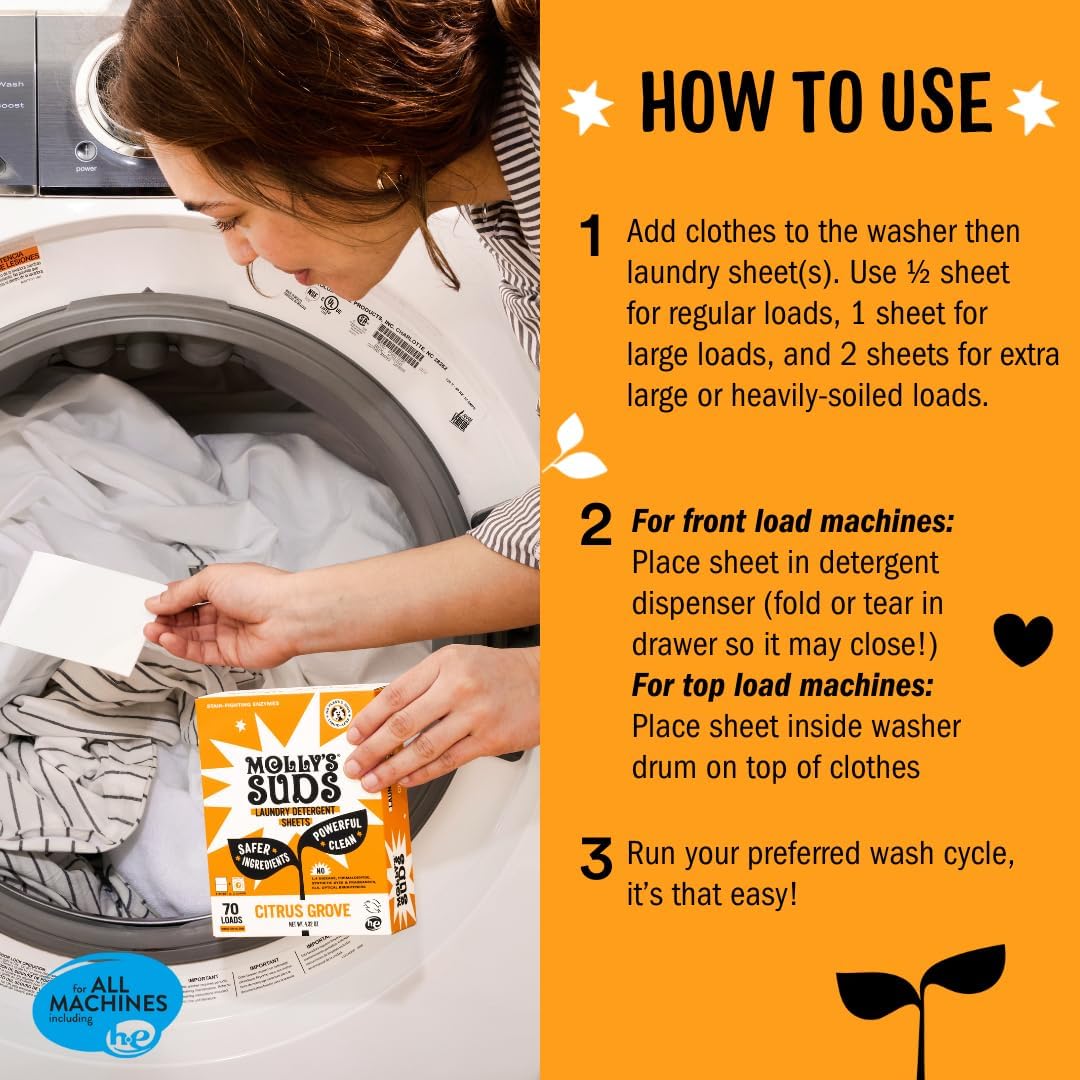 Molly’s Suds Laundry Detergent Sheets | Gentle on Sensitive Skin, Powerful Bio-Based Enzymes, Stain-Fighting | Liquidless & Plastic-Free Packaging | 120 Loads (Citrus Grove)