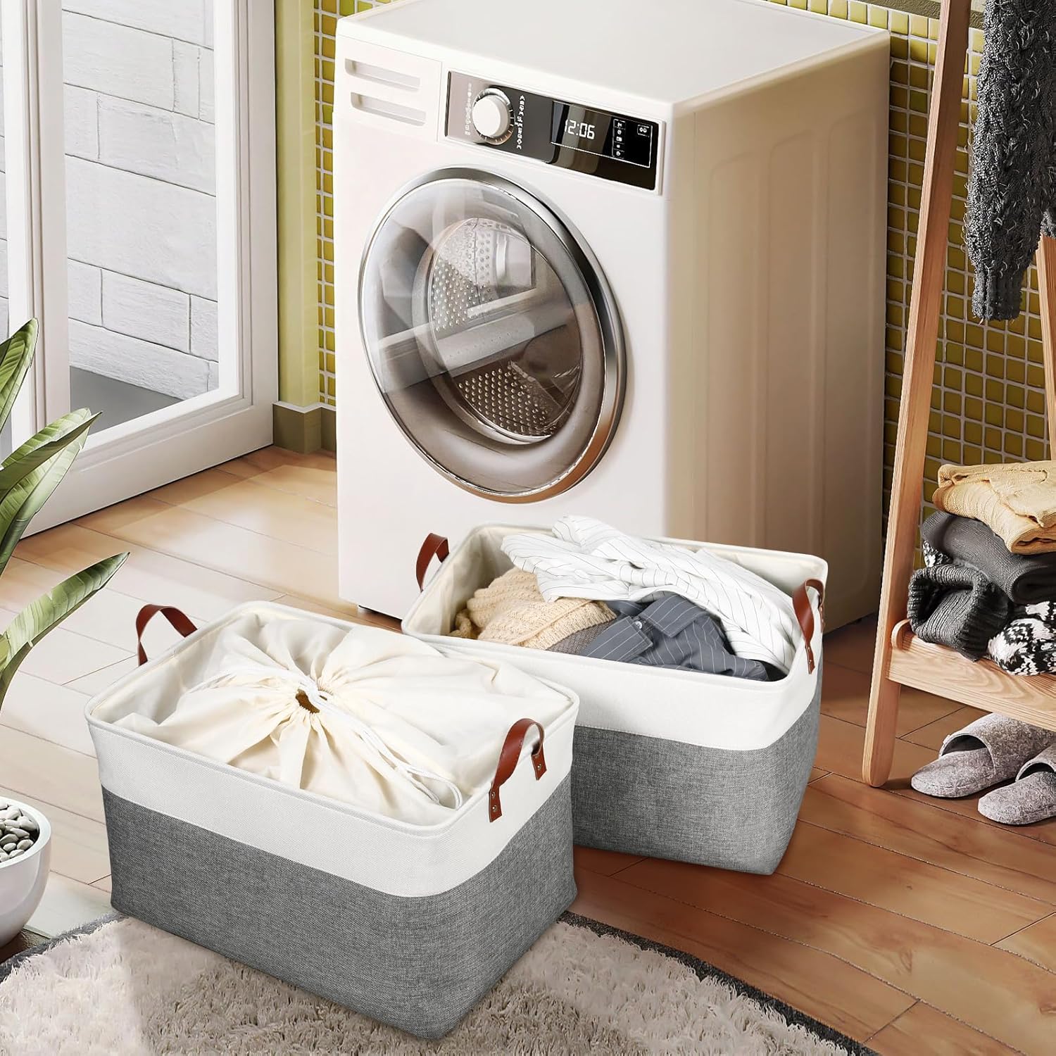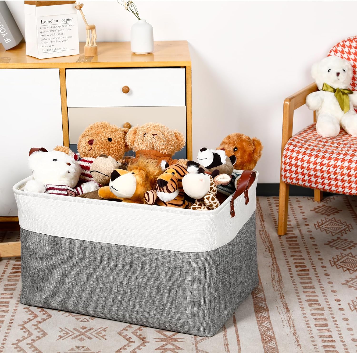 DULLEMELO Extra Large Storage Basket for Organizing, 70L Oversized Storage Bin Foldable Canvas Fabric Blanket Basket, 22" x 15" x 13" Large Kids Toy Basket Organizer with Handles (White&Grey)