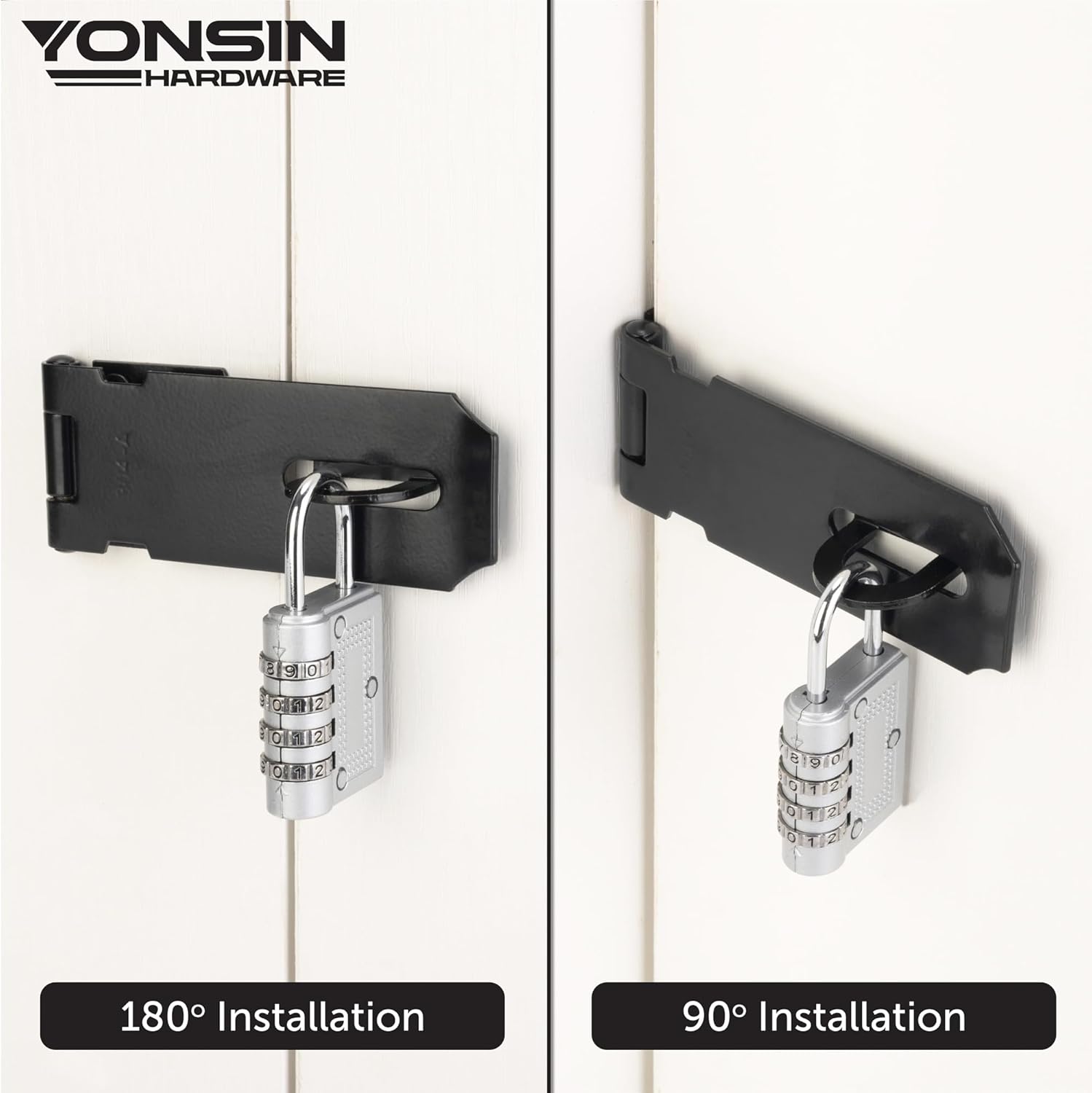 - 【Easy to Install Padlock Hasp Latch】 Maximum door hasp latch opening and closing is 300 degrees, suitable for both 180 degree and 90 degree installations. After determining the installation position, hasp and lock staple can be fixed with screws included.