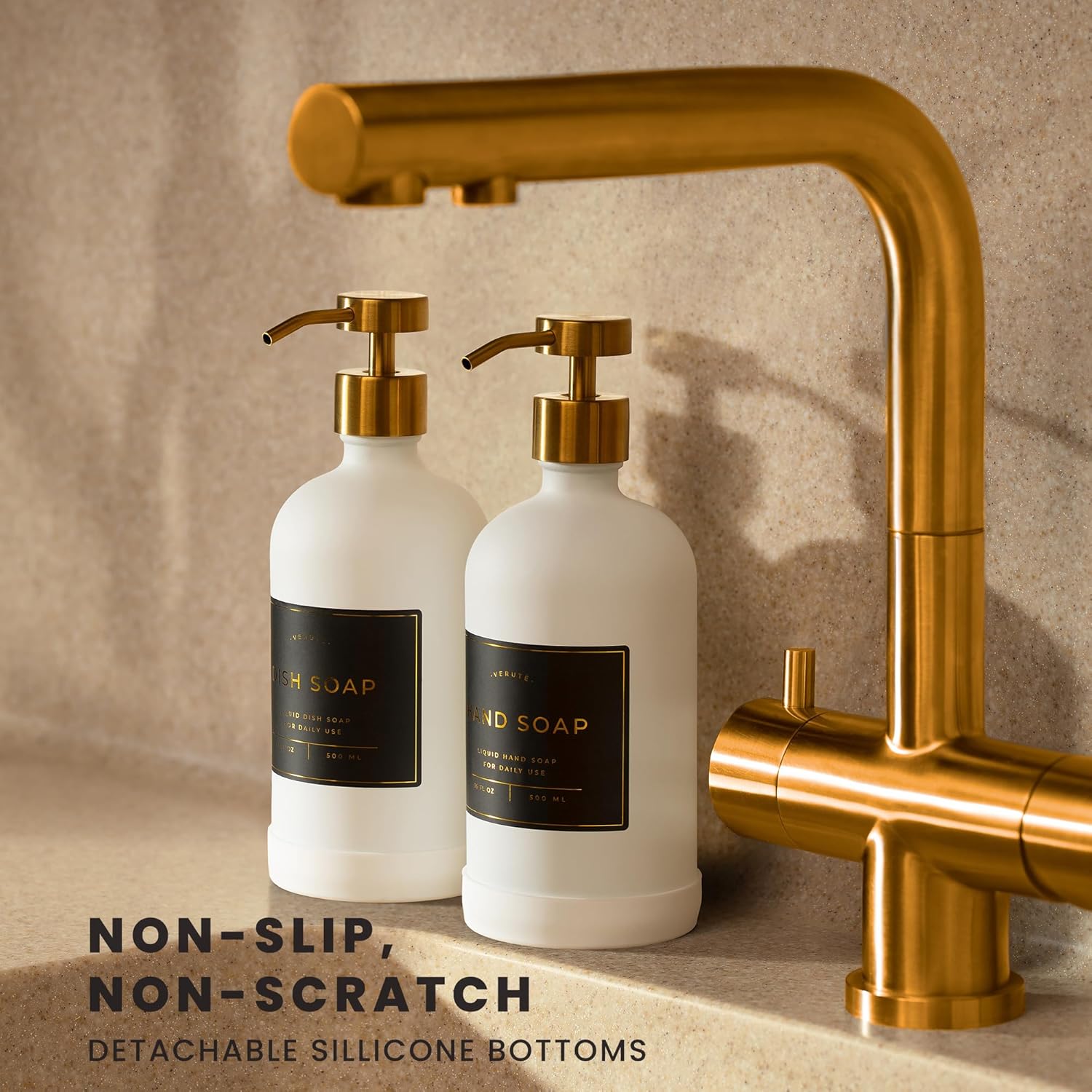 16oz Glass Soap Dispenser with Stainless Steel Pump, 21 Waterproof Labels, Non-Slip Protective Silicone Pad, Set of 2 for Bathroom & Kitchen (Matte White Bottle/Brushed Gold Pump)
