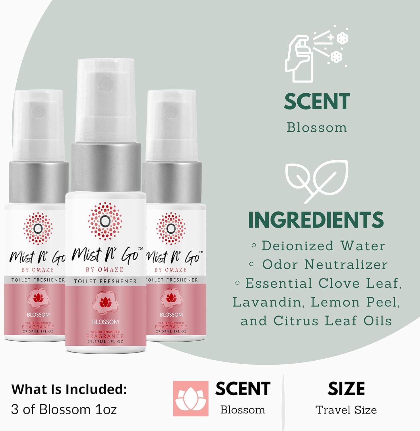 Mist N’ Go by Omaze Travel Bathroom Spray for Toilet Spray Odor Eliminator - Travel Toilet Spray for Bathroom Air Freshener Spray for Bathroom Deodorizer - Blossom Travel Size (1oz x3)
