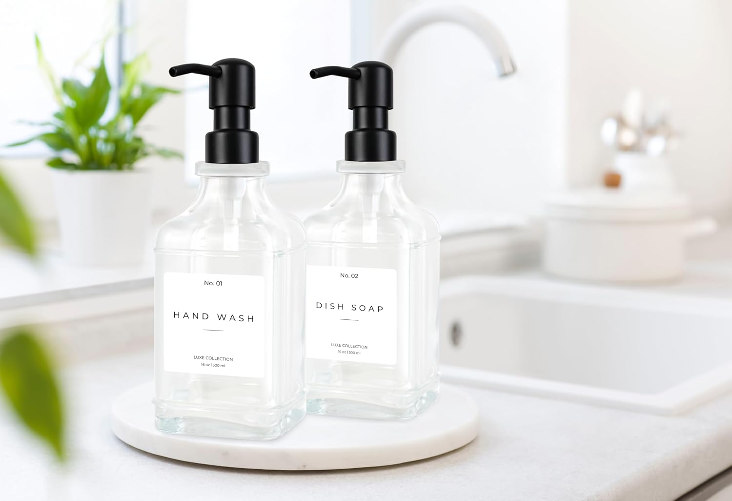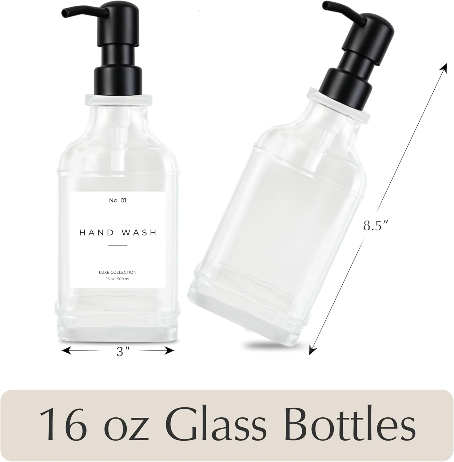 Emerson Essentials Glass Soap Dispenser Set – 16 oz 2-Pack – Refillable Dish & Hand Soap Dispensers for Kitchen or Bathroom – Stainless Steel Pump & 5 Waterproof Labels