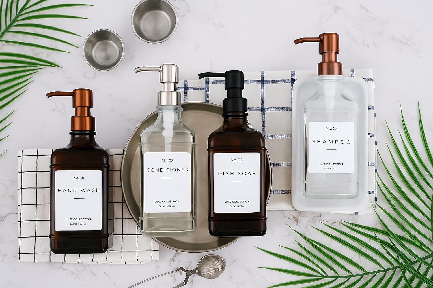- ✅ 5 WATERPROOF LABELS: Now with 5 stickers, it's your choice to use the Kitchen Soap Dispenser Set with Dish Soap for hand soap, dish wash, lotion, conditioner, or shampoo. To clean the lotion dispenser set for the bathroom and kitchen sink soap dispenser set, just run the bottle under water and watch any residue simply wash off. With our exclusive no-leak pump, the bottle enables you to put out a good amount of soap with a single pump.