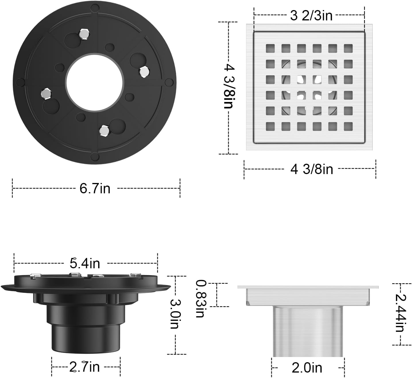 - 4" SHOWER DRAIN: 4-3/8 IN square shower drain with 2 inch central outlet. High flow design grate to avoid ponding