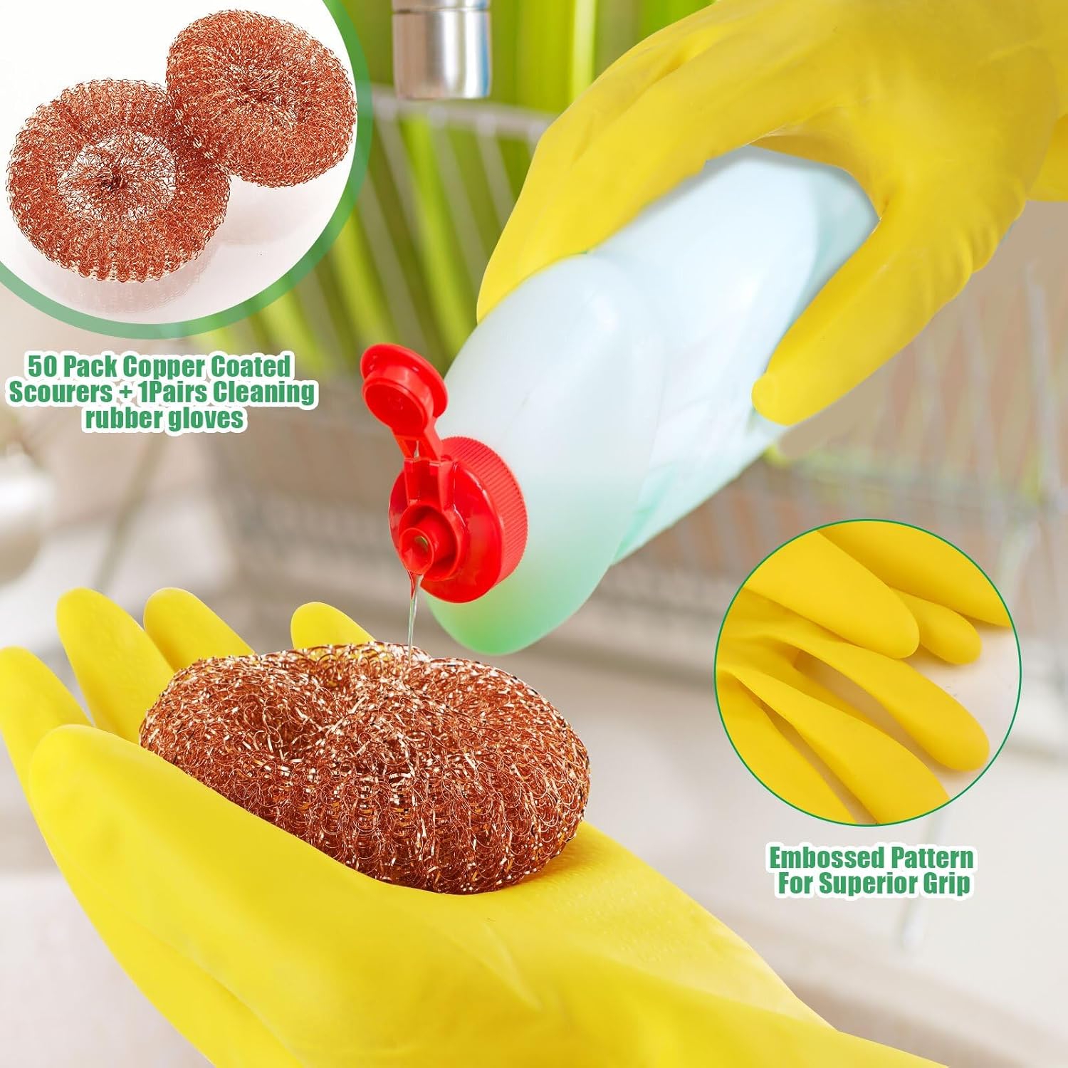 - Sufficient Quantity and Upgraded Experience: you will get 50 pieces of copper coated scourers and 1 pair of yellow reusable rubber gloves, classic combination and sufficient quantity, to meet your daily use, replacement and sharing needs