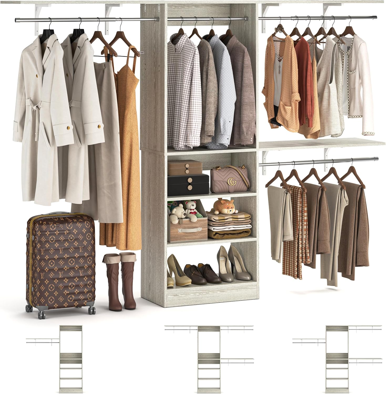 - 【Adjustable 96'' Closet Organizer System】iSunirm 96 inches wood closet organizer system has 3 expandable rods. Fits closets 5 feet to 8 feet wide, hang rods are also expandable, can be installed on only one side, or trimmed for smaller closets. The 3 wooden shelving towers can be cut to fit ( you need to cut it with your own saws). The interior shelves and the LEFT shelving tower are also adjustable, if you need to hang some long coats, you can just install the left shelving tower upper.
