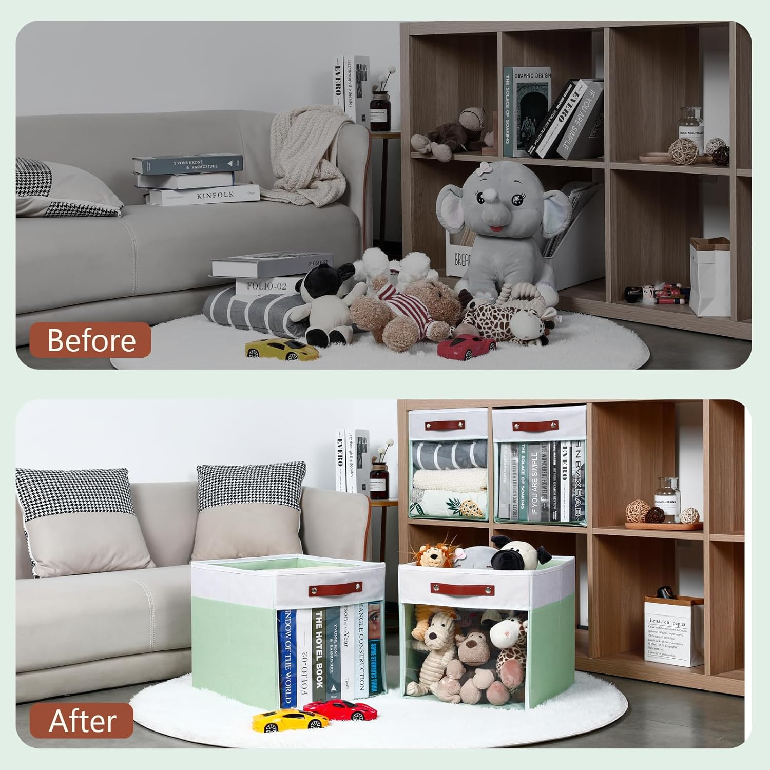 - 【FOLDABLE AND GOOD STORAGE】These decorative bins for cube organizer are foldable and easy to operate, just pull up the bottom plate to fold. When not in use, canvas foldable storage cubes is easy to fold flat, convenient storage occupies less space. At the same time, reduces the effort spent on storage.