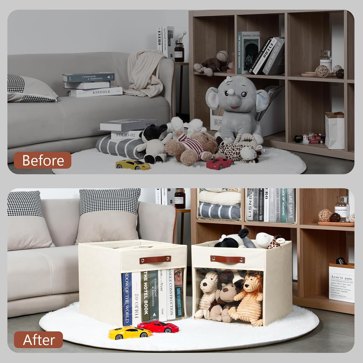 - 【Clear Cube Storage Bins】We have made an upgrade to the cube storage baskets for shelves by incorporating a clear window design. This feature enables you to easily and precisely view the cubby storage cubes organizer shelves stored inside. There will be no need to dig through the contents anymore.This will improve the efficiency of your search, which in turn will help you save valuable time and effort.