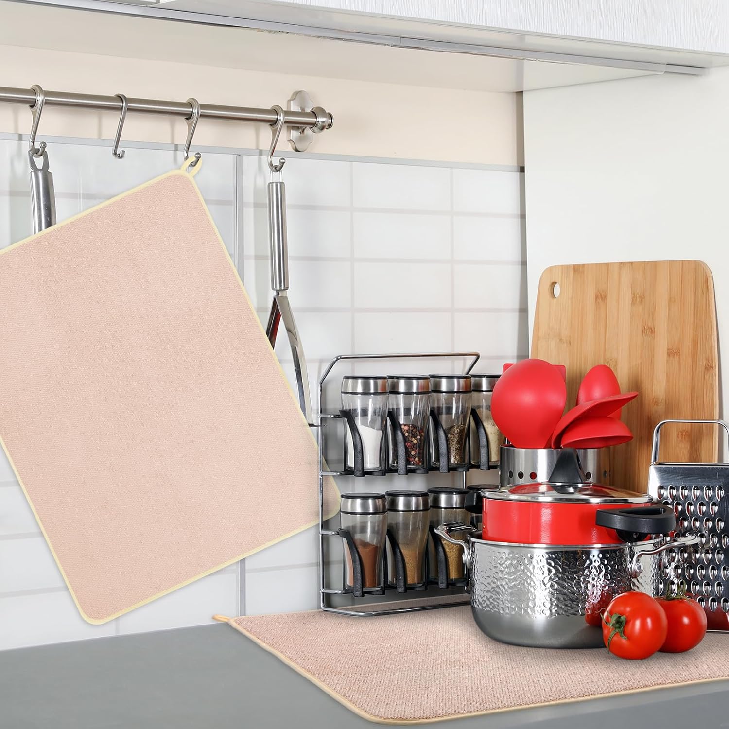- Reliable Material and Attractive Design: get the ideal balance of functionality and style with our kitchen drying mats for dishes; Made from microfiber, these mats exhibit impressive water absorbent property, ensuring a dry, clean countertop; Their pleasing beige color will effortlessly blend with most kitchen interior, enhancing its aesthetics