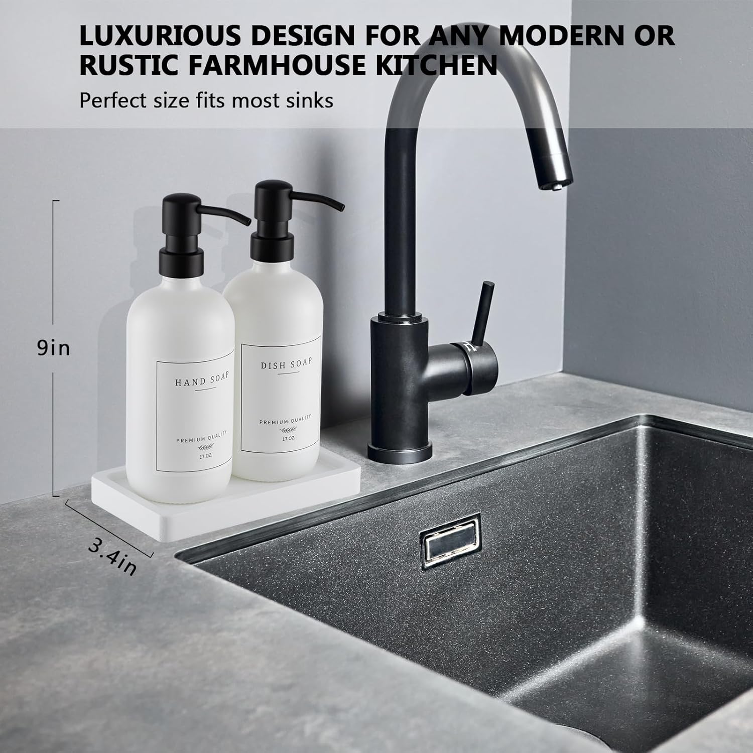 - MORE CLEAN AND ORGANIZED: This farmhouse style bathroom soap dispenser set is elegantly decorative and functional, keeps your kitchen or bathroom clean and classy, the white spill-proof tray with non-slip feet on the bottom is not like other wood that cracks easily, sturdy tray keeps your partner from moving the bottles all around the sink and doesn’t take up much room, make your kitchen area look more tidy and brings joy daily. Absolutely perfect for the modern farmhouse vibe or really any decor.