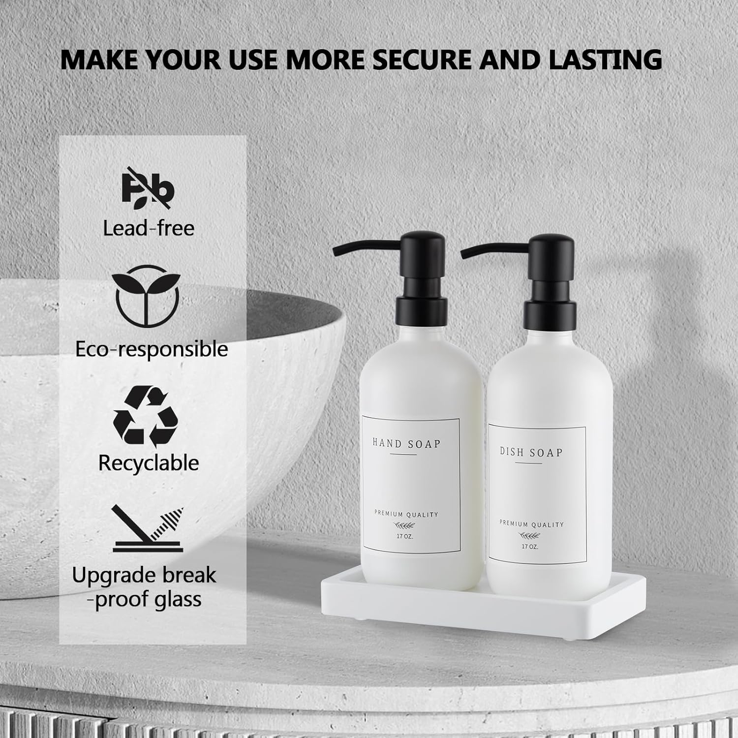 - GREAT VALUE FUNCTIONAL & AESTHETIC DISH AND HAND SOAP DISPENSER SET: 2 fortified lead-free reusable glass kitchen soap dispenser, 2 sleek black stainless steel pump to match your sink hardware, 1 collapsible silicone funnel, 1 durable waterproof soap dispenser tray, 7 kinds of waterproof stickers and 2 color ( Hand Soap, Dish Soap, Hand Lotion, Shampoo, Conditioner, Body Wash, Sanitizer), suitable for any style of home decor.
