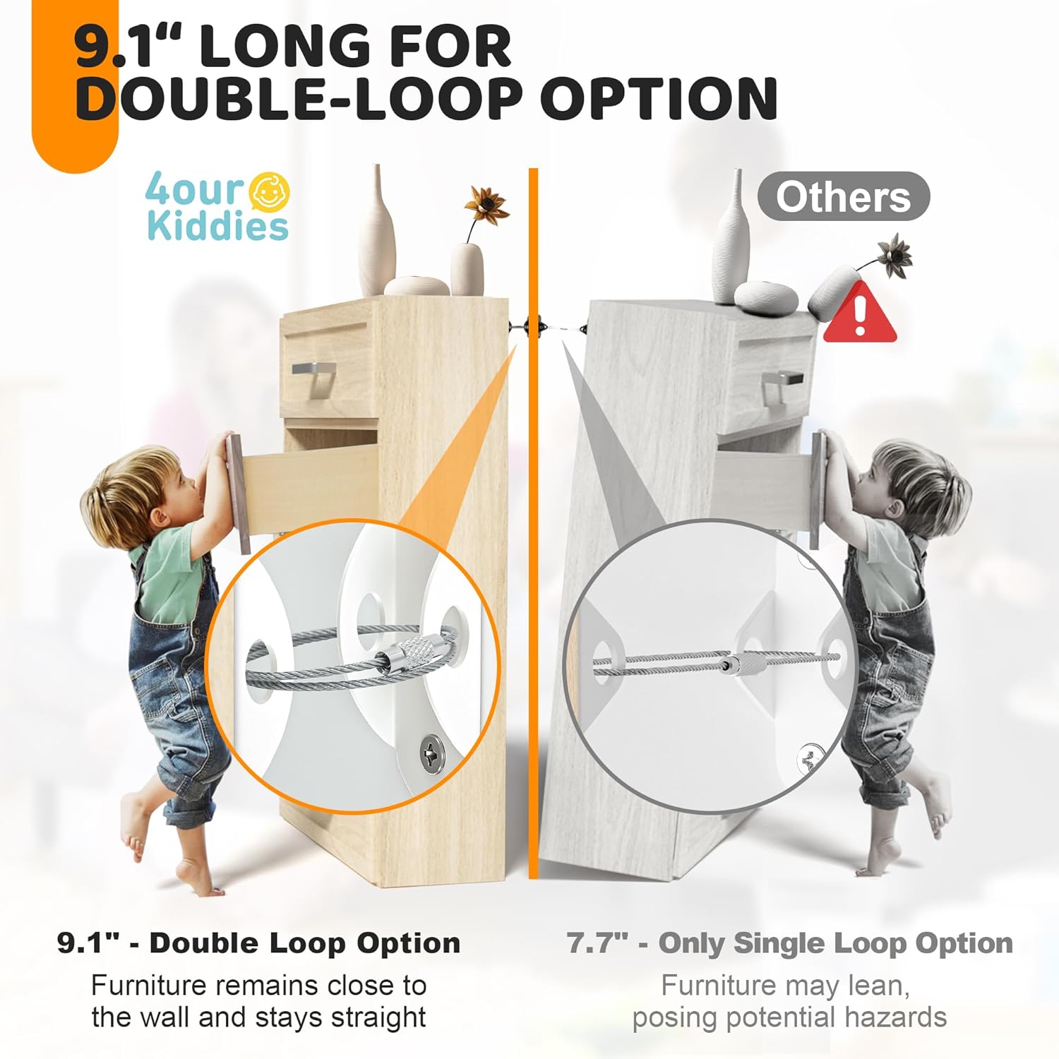 - BABY SAFETY - We know how curious children can be. When little ones climb on furniture there is a potential for a tip-over incident. The good news is baby proof furniture anchors can help to keep furniture secure in case your children pull out the dresser drawer to form a ladder and climb onto the dresser for fun. Even with up to 400 pounds of pressure, this anchor keeps furniture upright.