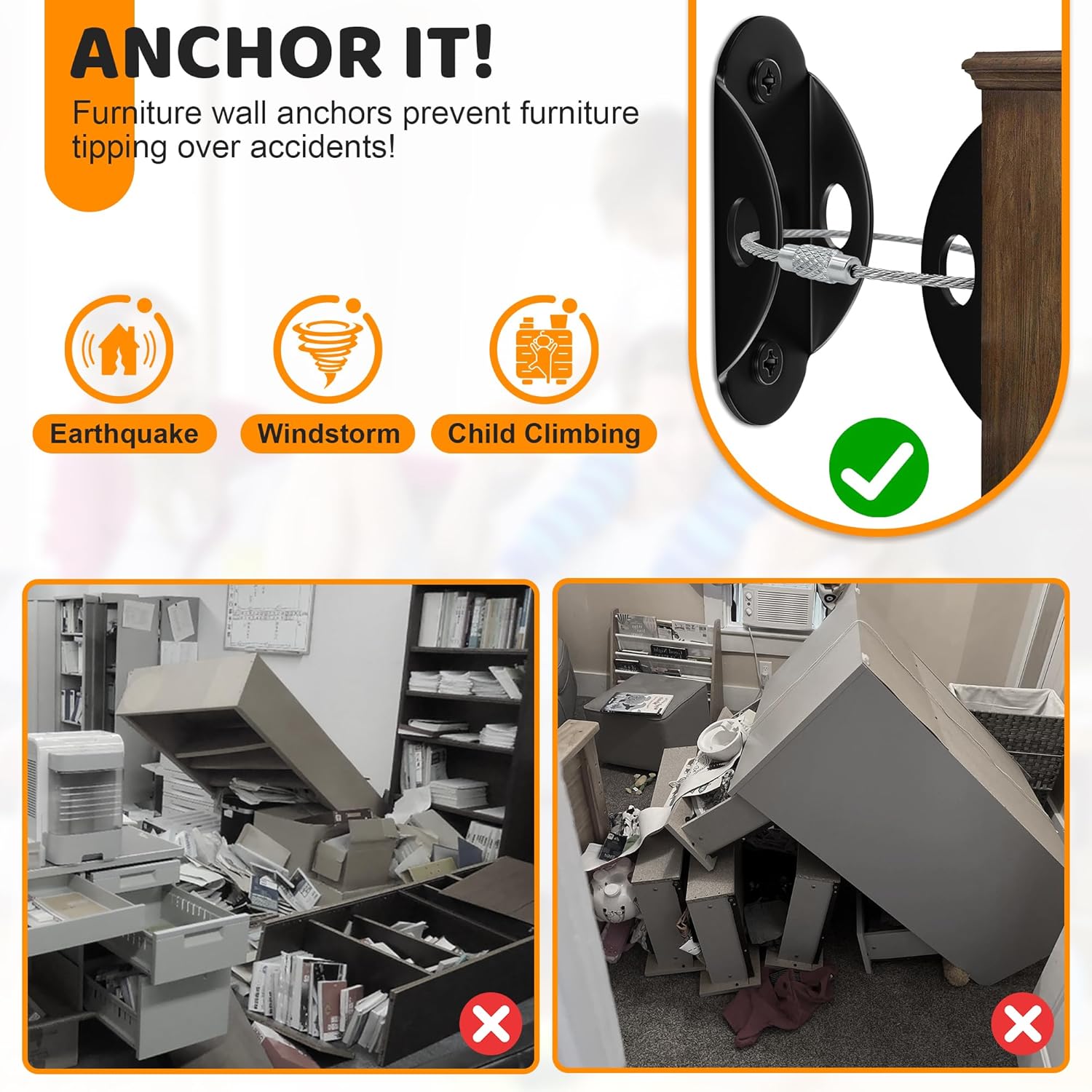 - EARTHQUAKE RESISTANT - Tall pieces of furniture like bookcases are easy to fall when the ground is rolling and shaking. You can prevent the furniture from falling on someone you care about by using these furniture wall anchors. The metal anchors work even in households without children - some data indicate that adults are also injured by furniture tip-overs.