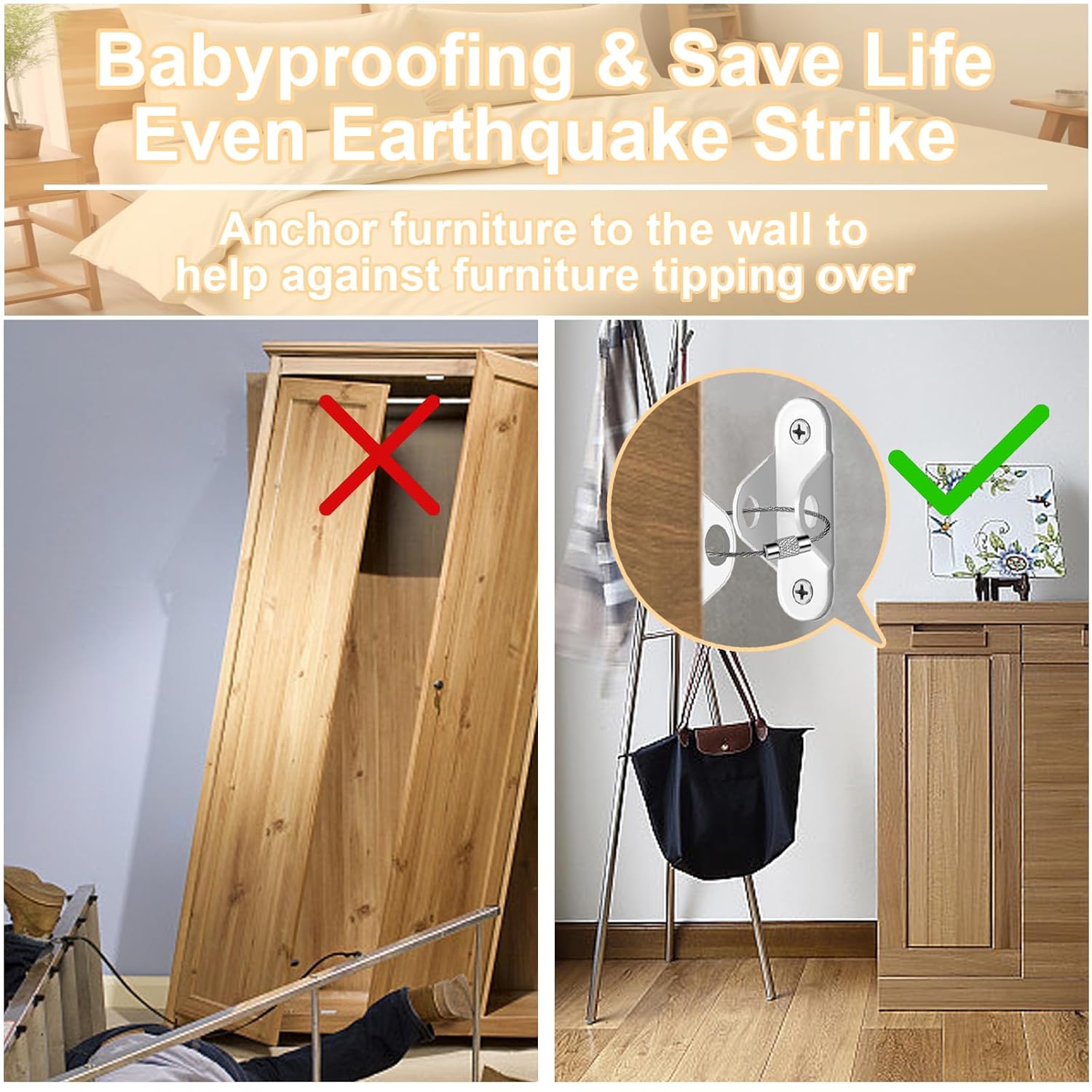 - 🔒 [Earthquake Resistant Furniture Straps] - Heavy and tall furniture like storage racks and bookcases are easy to fall when an earthquake happens. Anti-tip furniture anchors not only are designed to baby proof but also can withstand earthquakes and windstorms. The heavy-duty furniture straps can safely secure your furniture items especially the tall furniture that could slide or fall when an earthquake occurs below 5.5 quakes. We would advise 2 straps are used per furniture item for the best result!