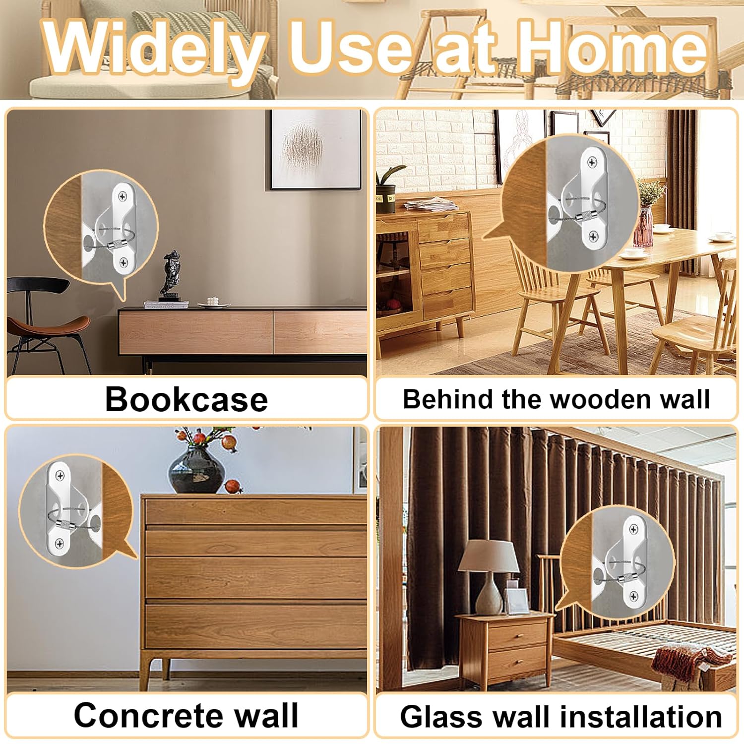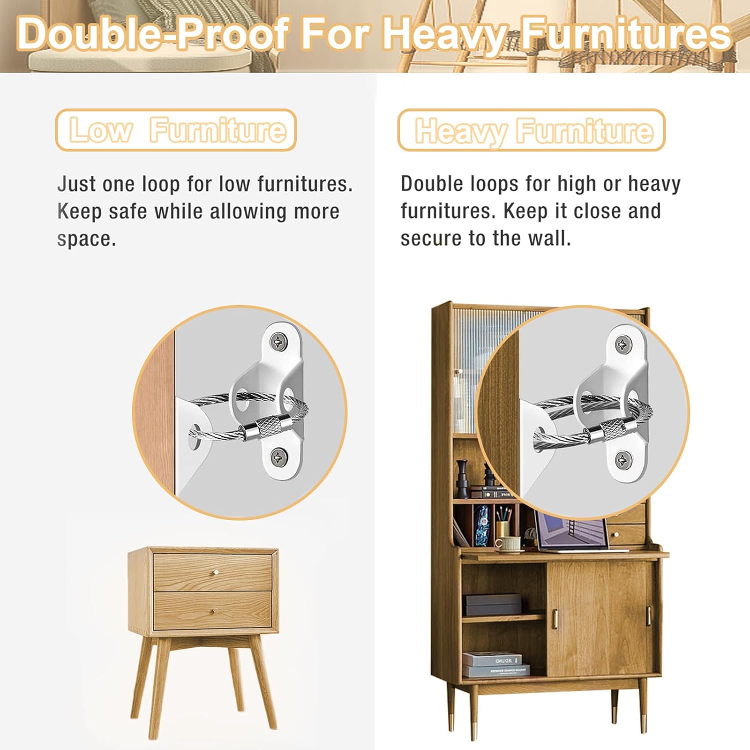 - 🔒 [Child Safety] - Nothing is more important than living in a safe place. The furniture anchors will secure your furniture in place firmly so you can be assured that your baby and pet won't be the victim of furniture tip-overs in your own home. Anchor the furniture wall anchor to prevent the top-heavy and unsteady furniture from dumping, create a safe and sound environment for your little one.